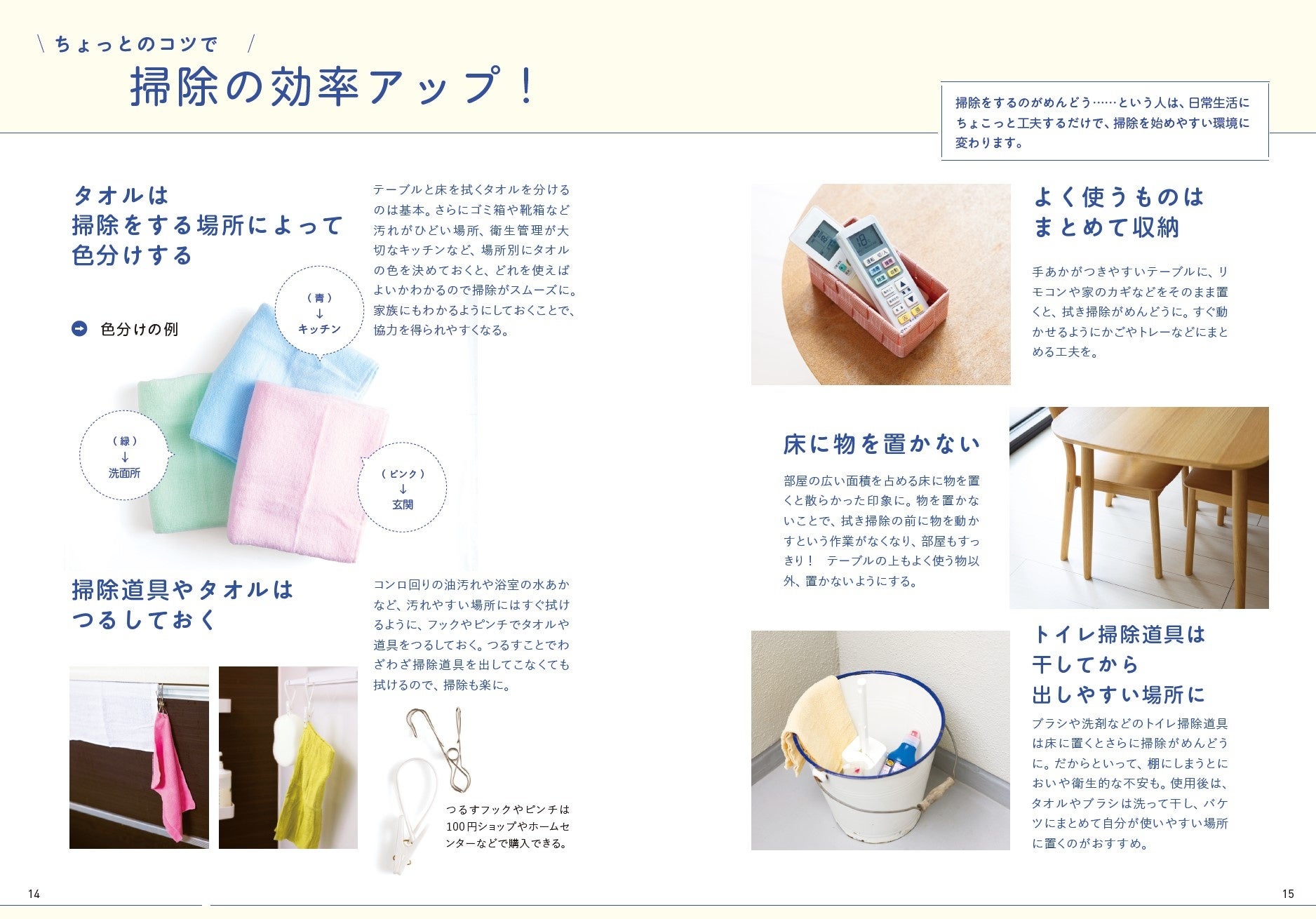本誌では、“世界一清潔な空港”に選ばれた羽田空港のベテラン清掃員である著者が、長年培ってきた“頑張らない、疲れない”清掃職人のワザを紹介。使いやすいタオルの選び方や持ち方をはじめ、毎日触るところほどこまめに水拭きする“ちょこちょこ掃除”や、ガラス窓や壁など広い面積を拭くときに疲れない“重心移動拭き”、“ダニやカビを予防し、無駄をなくす“健康と節約につながる掃除術など、日々の掃除がグンと楽になりモチベーションもアップする、よいことだらけのお掃除術をたっぷり収載。プロならではのワザを知っておけば、毎日の掃除はもちろん、年末年始の大掃除がぐんとラクになること間違いなしです!