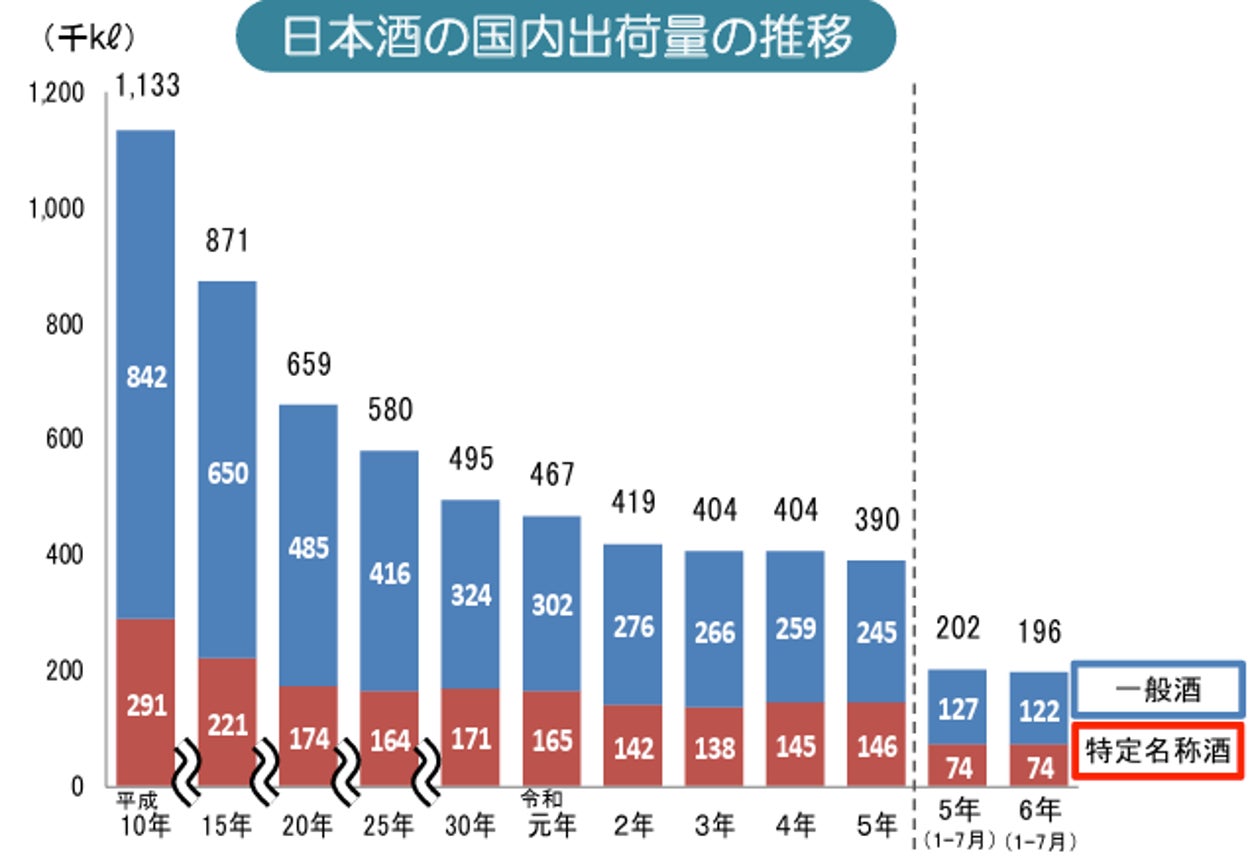 農林水産省農産局の調査によれば、『日本酒の国内出荷量は、ピーク時(昭和48年)には170万㎘を超えていましたが、他のアルコール飲料との競合などにより減少傾向で推移。平成30年以降は国内出荷量の減少幅が大きくなり』、『令和5年では約39万㎘まで減少』しています。