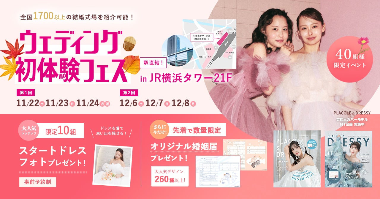 「PLACOLE & DRESSY」ブランドを展開する冒険社プラコレ(本社:神奈川県鎌倉市、代表取締役CEO:武藤功樹)は、横浜駅直結JR横浜タワー21F、ウェディングの魔法にかかる空間"DRESSY ROOM YOKOHAMA"にて、11/22(土)-11/24(月祝)の3日間限定で、これから結婚式をお考えのカップル様に向けた、個室相談やウェディングドレス試着ができる豪華特典付きのウェディング初体験フェスを開催いたします。(40組様限定、無料開催)