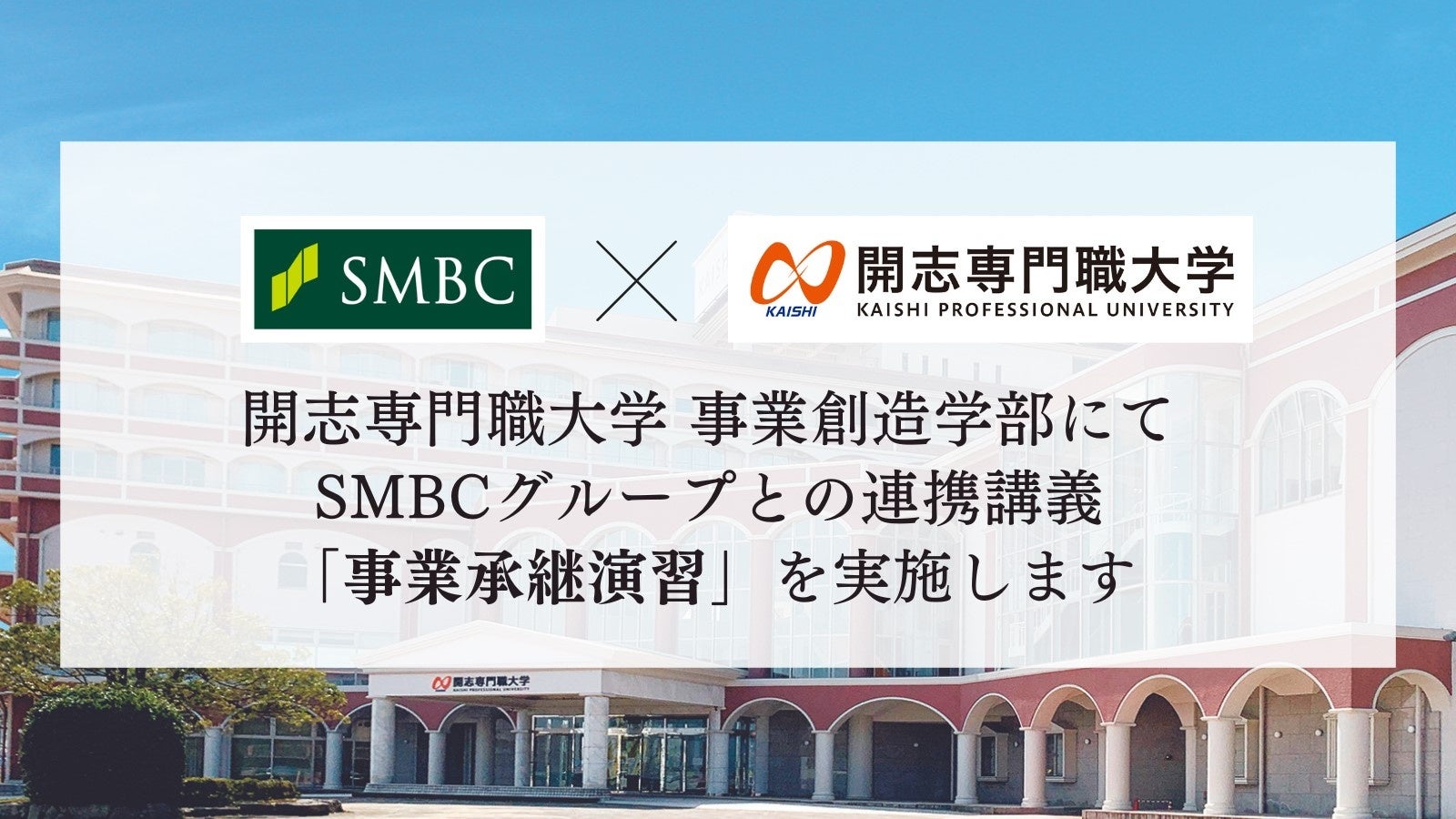 NSGグループ学校法人 新潟総合学院 開志専門職大学(以下「本学」、新潟県新潟市、理事長:池田祥護、学長:北畑隆生)事業創造学部では、2023年2月6日(月)~9日(木)の4日間にわたり、株式会社三井住友フィナンシャルグループ(執行役社長グループCEO:太田 純、以下、同社グループを総称して「SMBCグループ」)、株式会社三井住友銀行(頭取CEO:髙島 誠、以下「三井住友銀行」)と連携した集中講義「事業承継演習」を実施いたします。本講義は、事業承継に必要な知識の修得と、企業経営のパートナーとなる銀行の業務・融資業務等について理解することを目的に、全15回にわたって開講します。