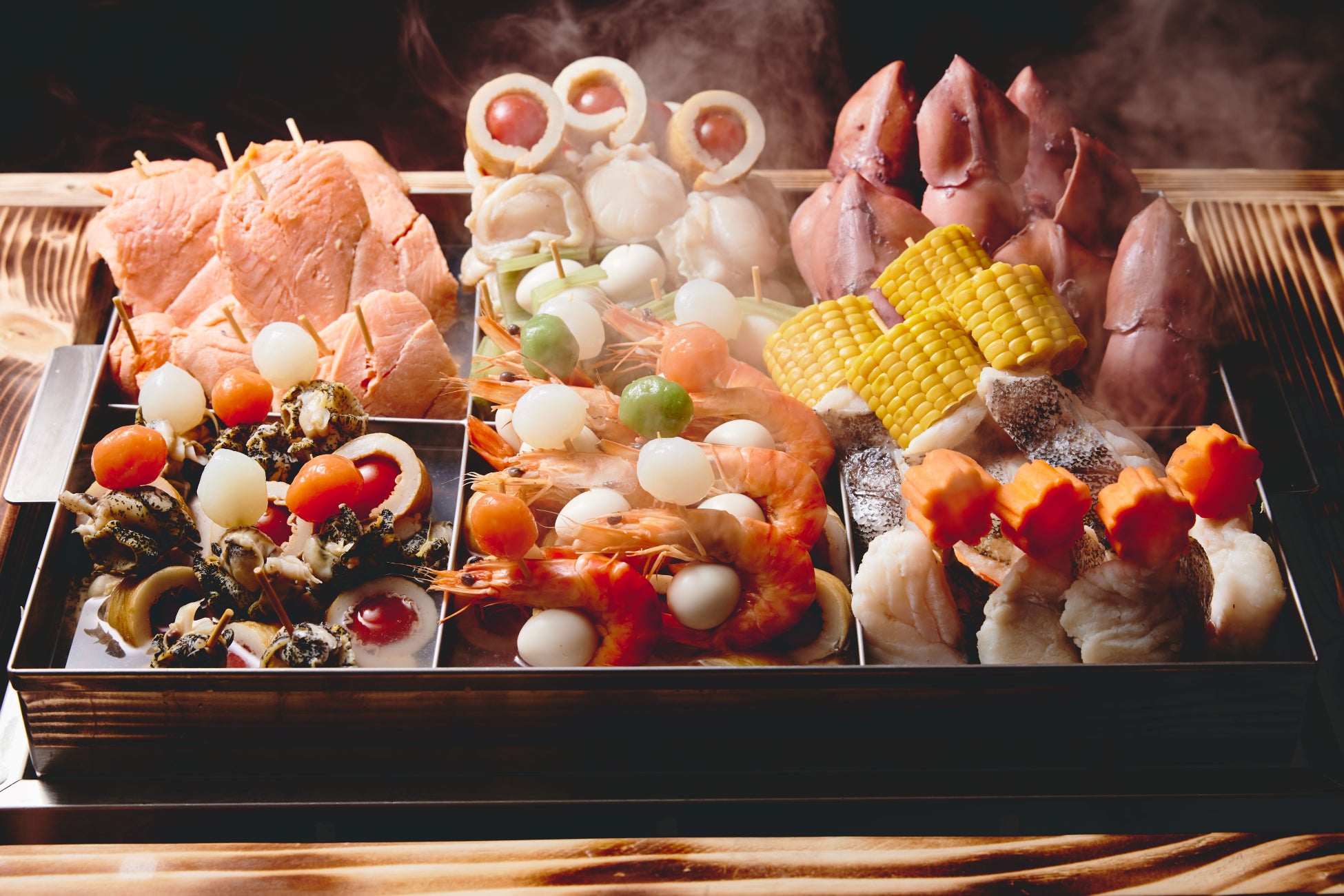 こたつで暖をとりながら昆布出汁のきいたおでんを楽しめる「スキーインスキーアウトこたつラウンジ」を開催します。カニやエビなどの豪華な海鮮と、フキやタケノコなどの山菜をふんだんに使用したバリエーション豊かな「スペシャルおでん鍋」や、エビ、鮭など様々な魚介とフキやタケノコなど山菜との組み合わせが楽しめる「おでんバー」を用意。雪景色を前にこたつで暖まりながら、北海道ならではのおでんを堪能することができます。