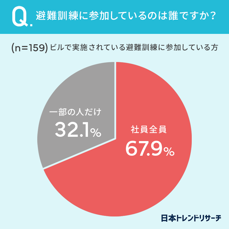 67.9%と7割近くの方が、「社員全員」で避難訓練に参加していると回答しました。