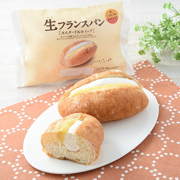 【内容】生クリームを配合したしっとりやわらかな生フランスパン生地に、生クリーム入りのカスタードクリームと、ミルク風味のホイップをサンドしました。