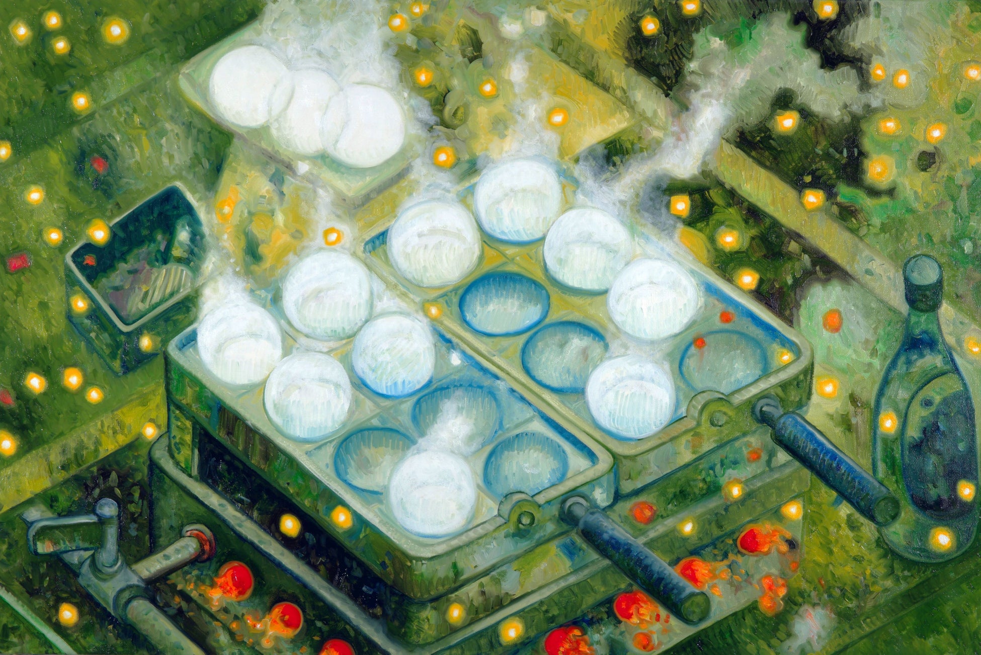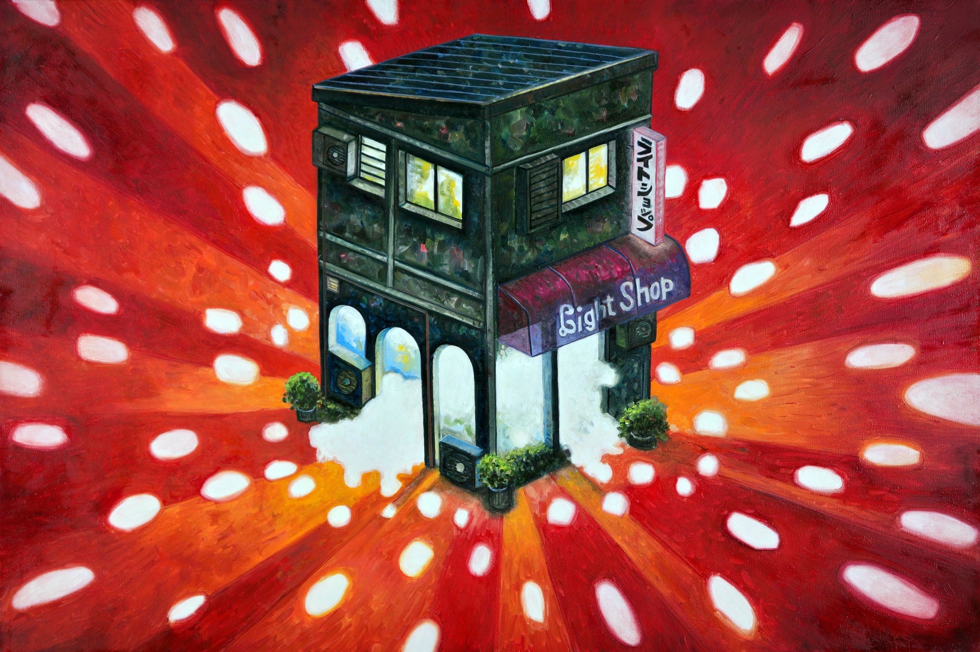 東京とニューヨークに拠点を置きながら制作活動を行う、ブラジル・サンパウロ生まれのアーティスト、大岩オスカール。それぞれの都市の環境や社会課題をテーマに風刺やユーモアを交えて描かれた、俯瞰的でダイナミックな絵画作品は高い評価を得ており、国内外の美術館にも多数作品が収蔵されています。京都 蔦屋書店での開催に続き、銀座での開催となる今回の個展では新作4点が加わり、「ライトショップ」というタイトルが示すように、光を象徴的に描いたシリーズを発表。健康な体を作りあげるためには食べ物が重要なように、心の栄養となる「精神的な食べ物」とはどんなものか、それを提供するお店とはどんなものかという想像から温かな物語が展開されます。光のもとに人々が集まる心地よい場所の象徴として、小さな「屋台」も会場に設置。