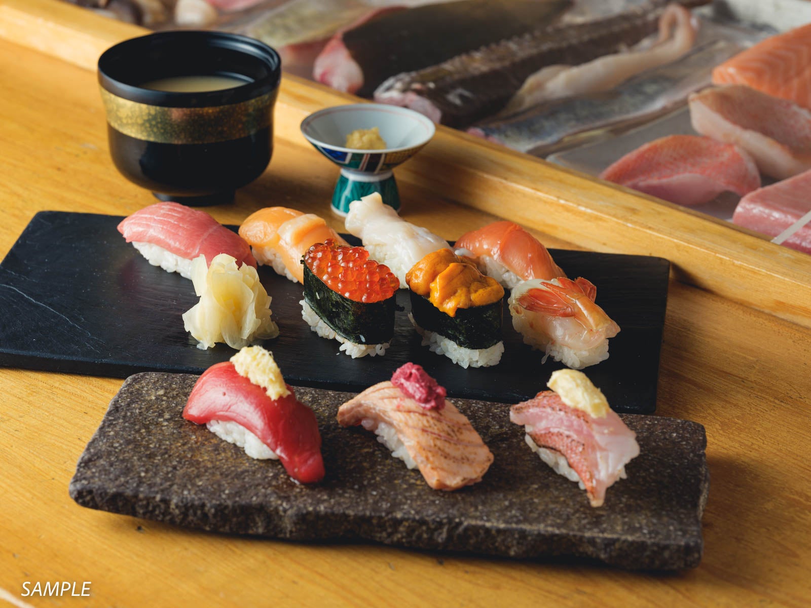 大将厳選のマグロ、牡丹エビなどの魚介のほか、とよとみフレーバーバターを加えた創作にぎりもお楽しみに。