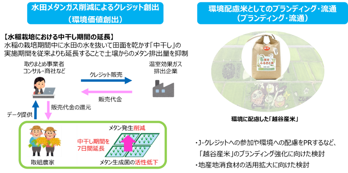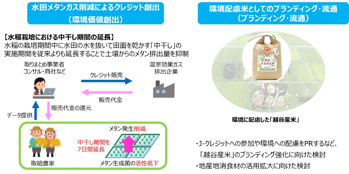 本協定に基づき越谷市は、頻発・激甚化している洪水などの水災害に対し、水田が持つ雨水貯留機能を利用した治水対策である「田んぼダム」の実証実験を通じた効果の検証や環境価値の検討(Jクレジット※2創出、ブランディング等)を行うことで水田のポテンシャル調査を実施いたします。