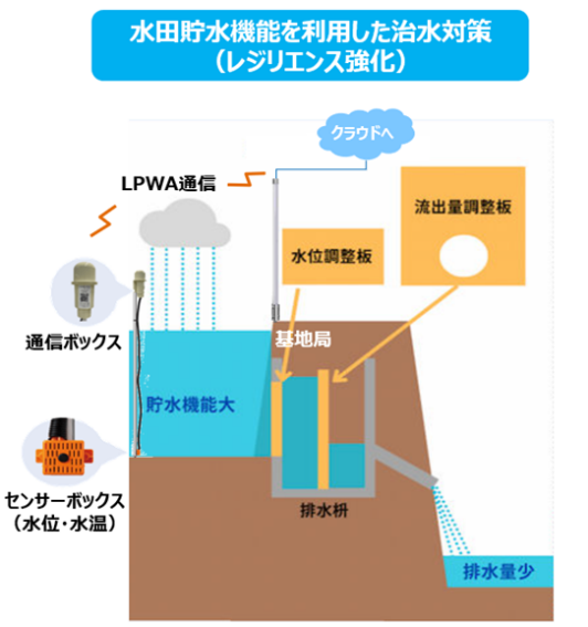 本協定では、NTT東日本が提供したICT装置を活用し、水田の多面的機能に関する調査を行います。具体的には、①水田の雨水貯留機能による水害リスク低減調査、②水位計測によるJクレジット創出模擬トライアルを行います。