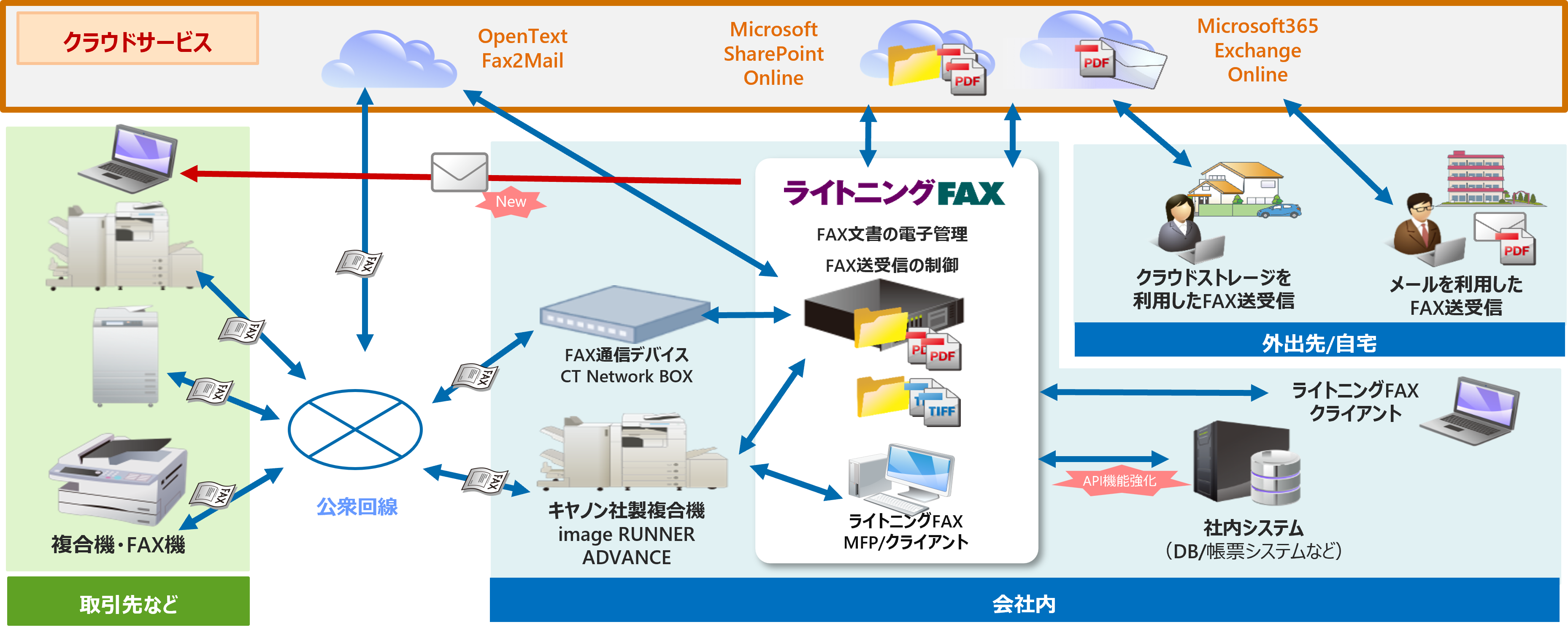 クラウド型FAXサービス「OpenText Fax2Mail」と接続することが可能なオプション製品です。ライトニングFAXのクライアントソフトウェアを操作し「OpenText Fax2Mail」経由でFAX送受信を実施、API機能により業務システム・データベースシステムなどと連携した、クラウド型FAX回線対応のFAXシステムを構築することができます。