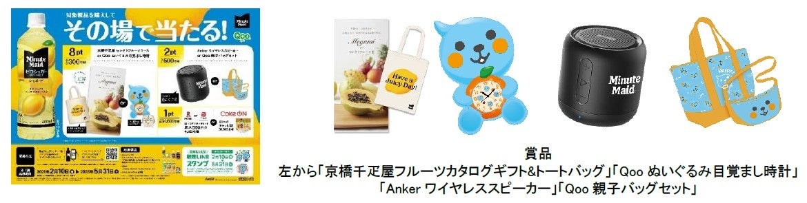 キャンペーン第1弾では、「ミニッツメイド」、「Qoo」オリジナルアイテムや、500円分のデジタルポイントなどが合計35,500名様に当たります。また、購入者全員にオリジナルデザインLINEスタンプを配布します。