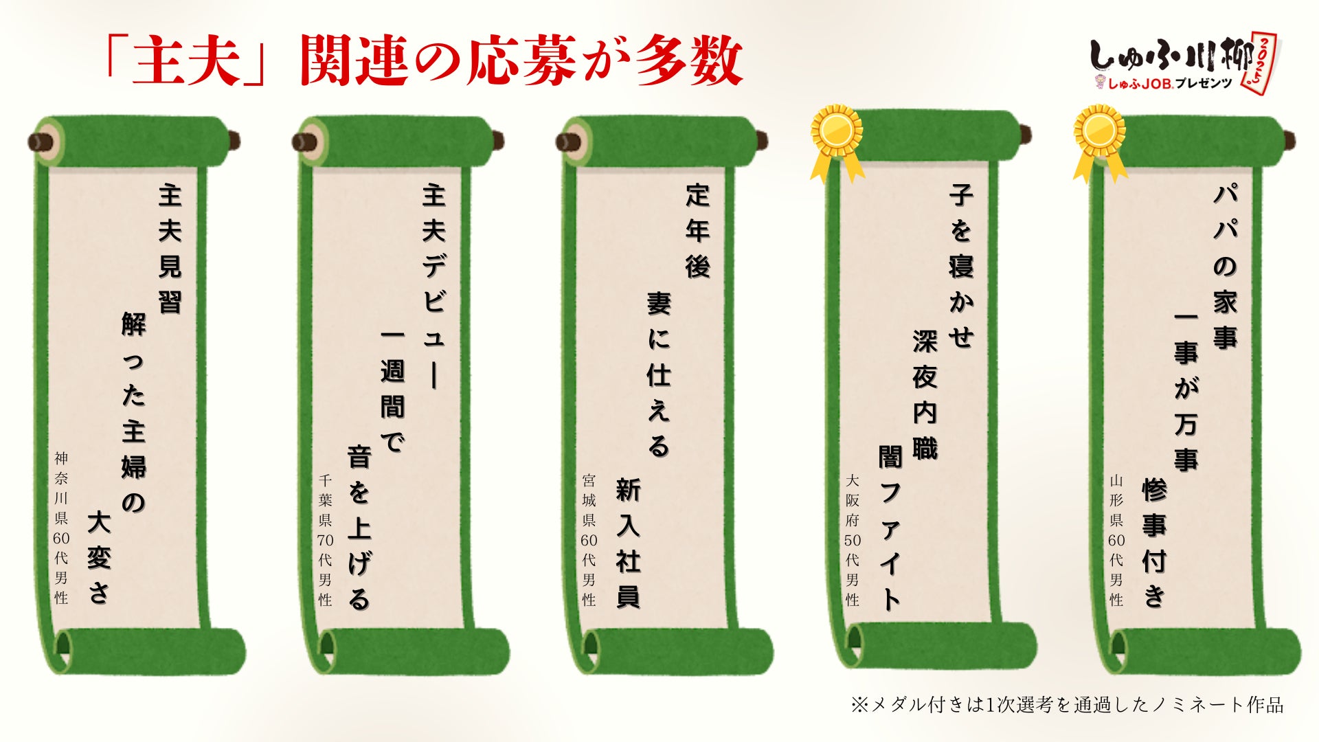 今年の「しゅふ川柳」では、「主夫」に関する作品が約150件寄せられ、昨年同様、注目度の高い結果となりました。今年は50代以降の男性からの応募が大半を占めており、定年後に新米主夫としてしゅふ業に挑戦する姿が詠まれていました。