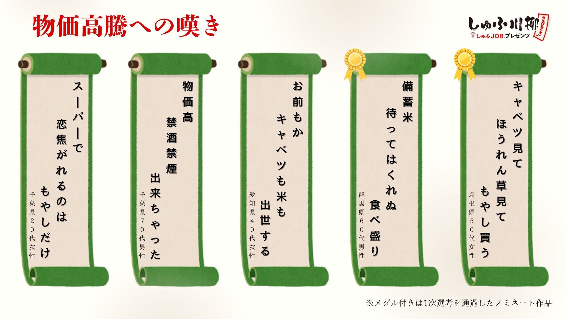 また、物価高に加え、「年収の壁」との関連を詠んだ作品も多数寄せられ、家計への負担の増大を表現した川柳が目立ちました。