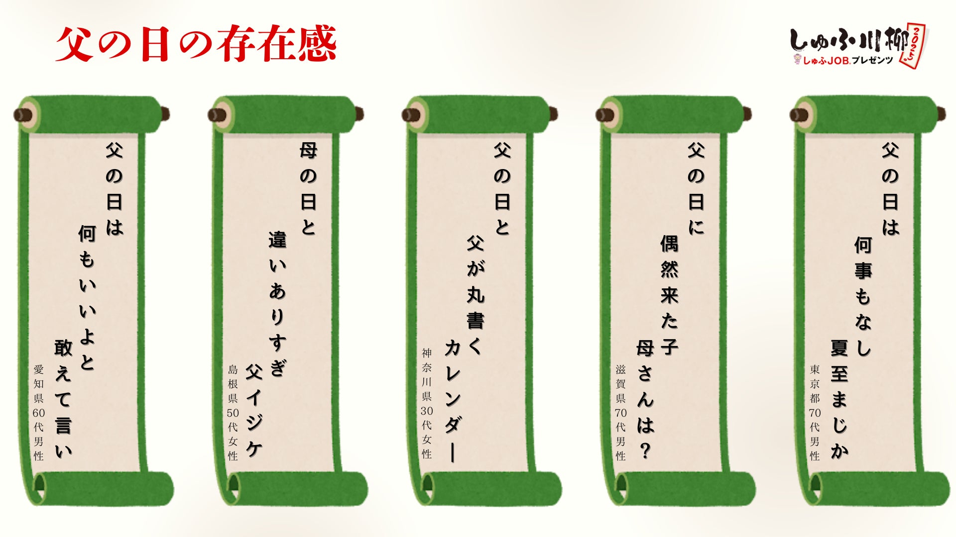 また、「父の日をもっと祝ってほしい」とアピールする父親の様子が描かれた作品も目立ちました。家族に対して控えめにアピールするものから、冗談交じりに訴えるものまで、ユーモアたっぷりに表現された川柳が数多く寄せられました。