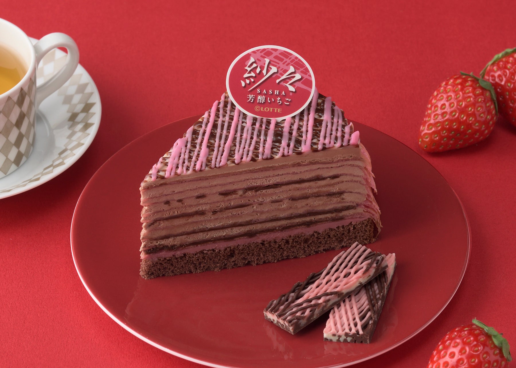 「紗々<芳醇いちご>」の繊細な見た目とパリパリ食感はもちろん、甘ずっぱい苺チョコとホワイトチョコ、ビターチョコ、3種類のチョコの味わいと、ほどける口どけをミルクレープで表現。味わいが濃厚な苺ガナッシュ、苺風味クレープ、チョコクリームを重ねて、パリパリチョコをサンド。上面はいちご風味チョコソースとホワイトチョコソース、ミルクチョコソースで仕上げました。