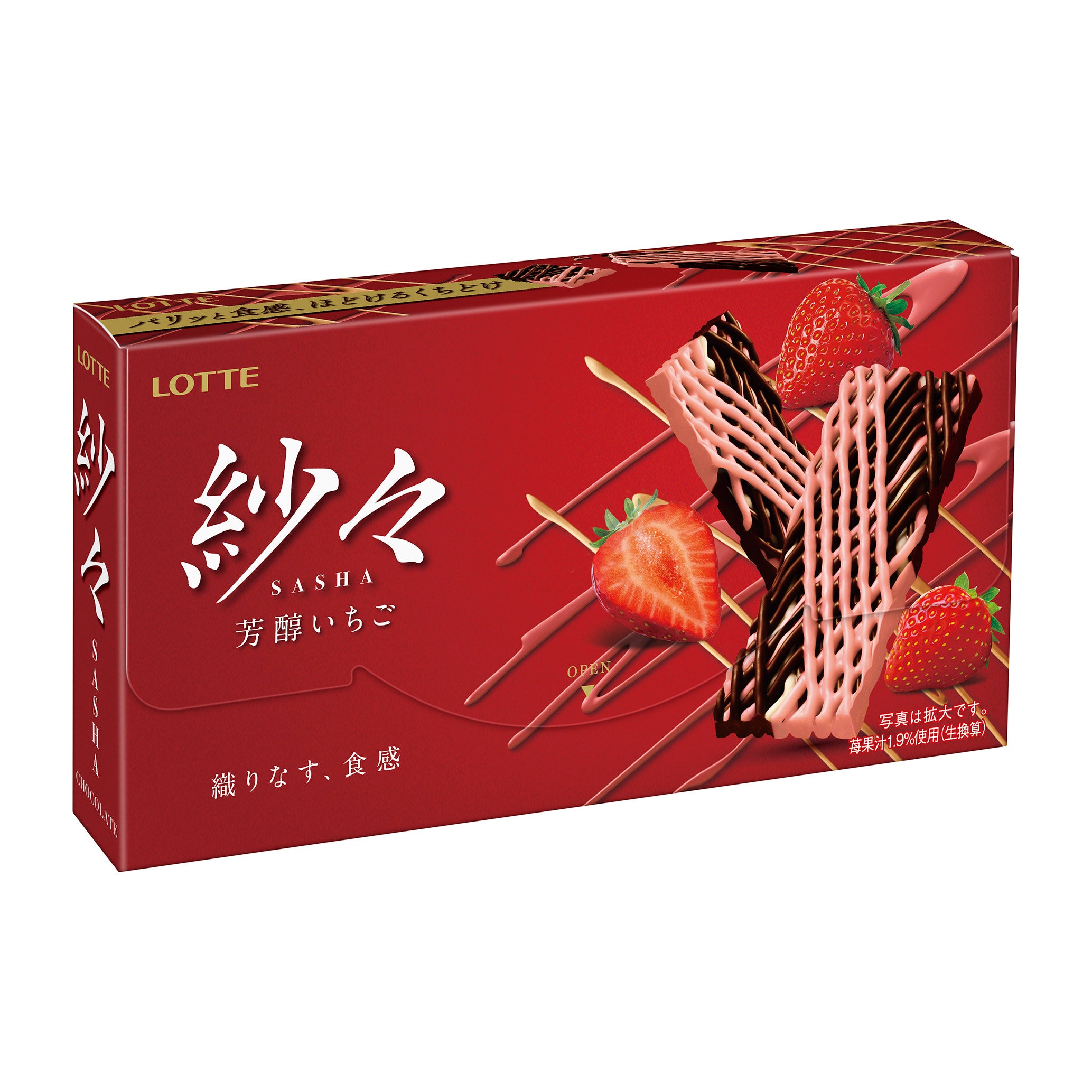 1995年誕生のロングセラー「紗々」。「紗々<芳醇いちご>」は2021年9月に発売。約1.5mmの線状の3種のチョコレート(いちご・ビター・ホワイト)を約1,350本編み上げることで、パリっとした繊細な食感と、ほろほろとほどける口どけを生み出しています。