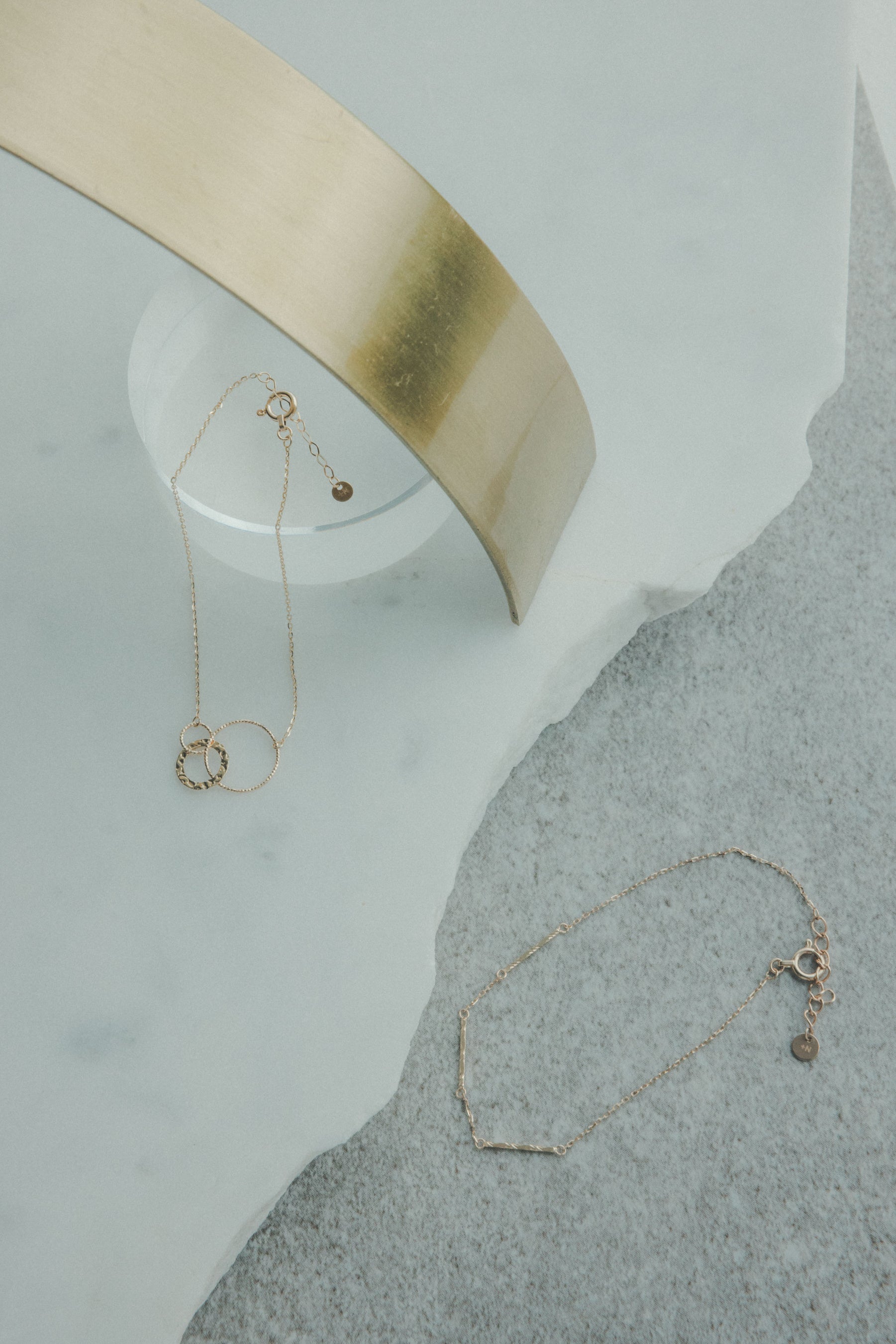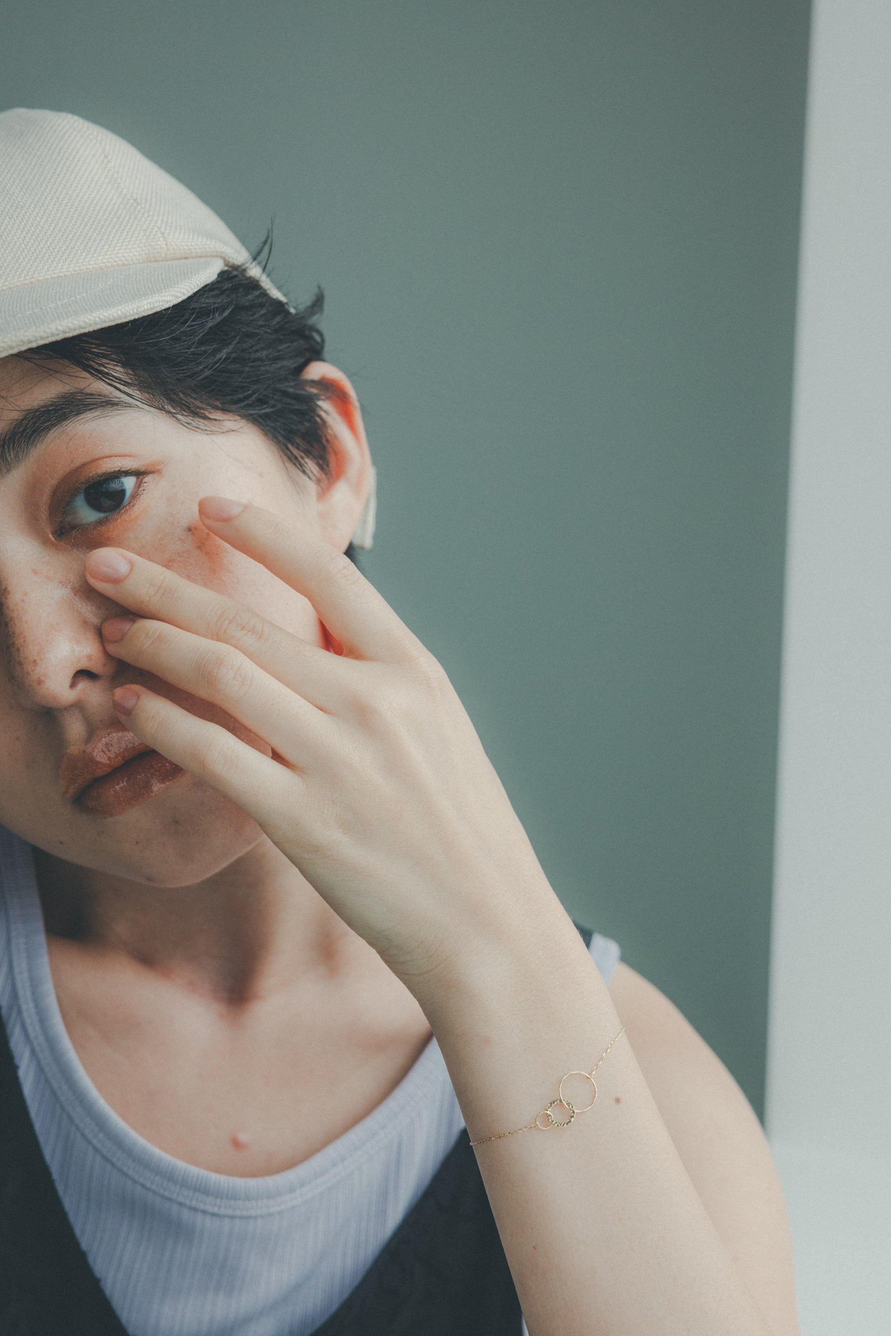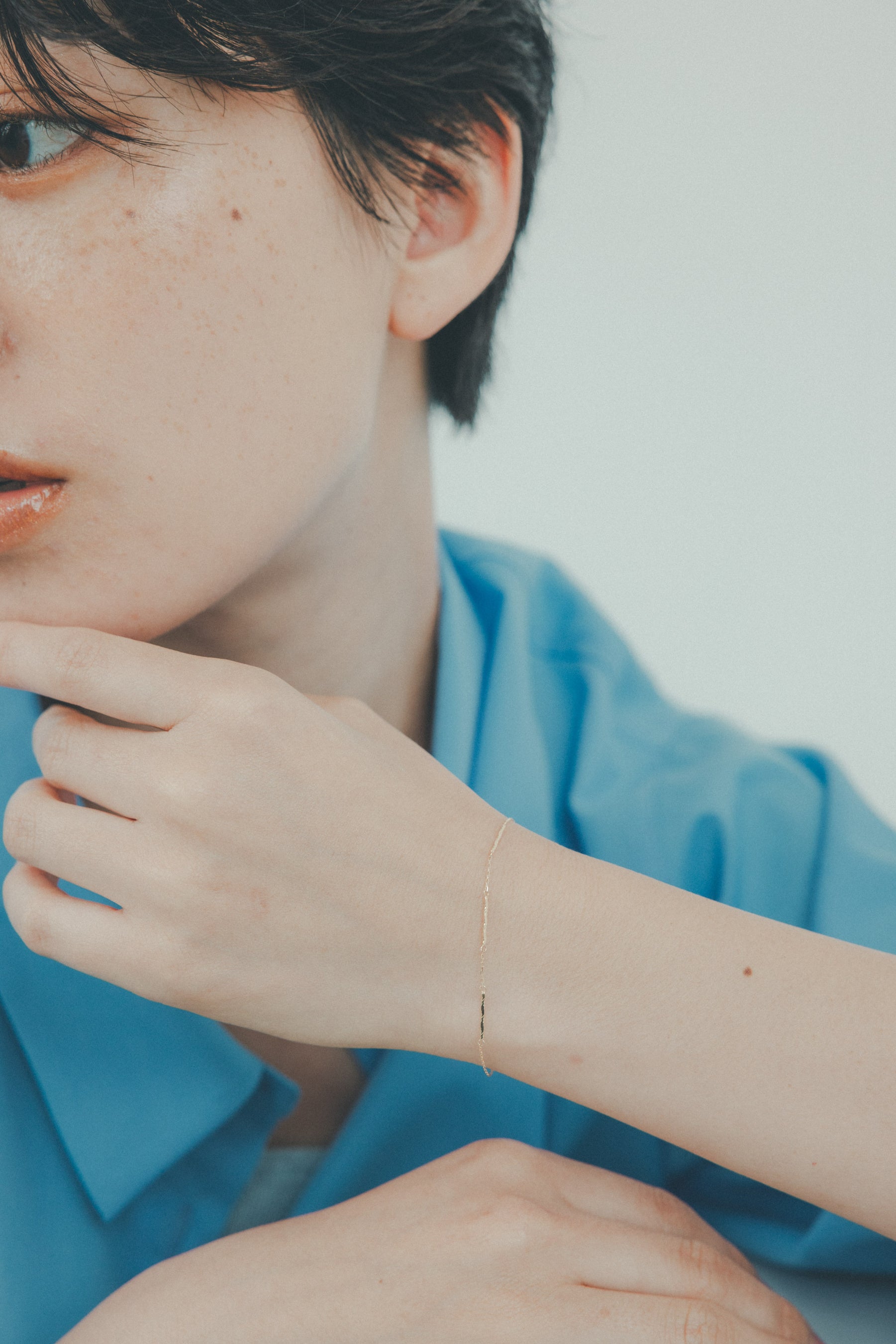 10金のシンプルなチェーンに、地金のラインパーツを配置したステーションブレスレット。凛とした表情を見せ、コーディネートを繊細に彩ります。