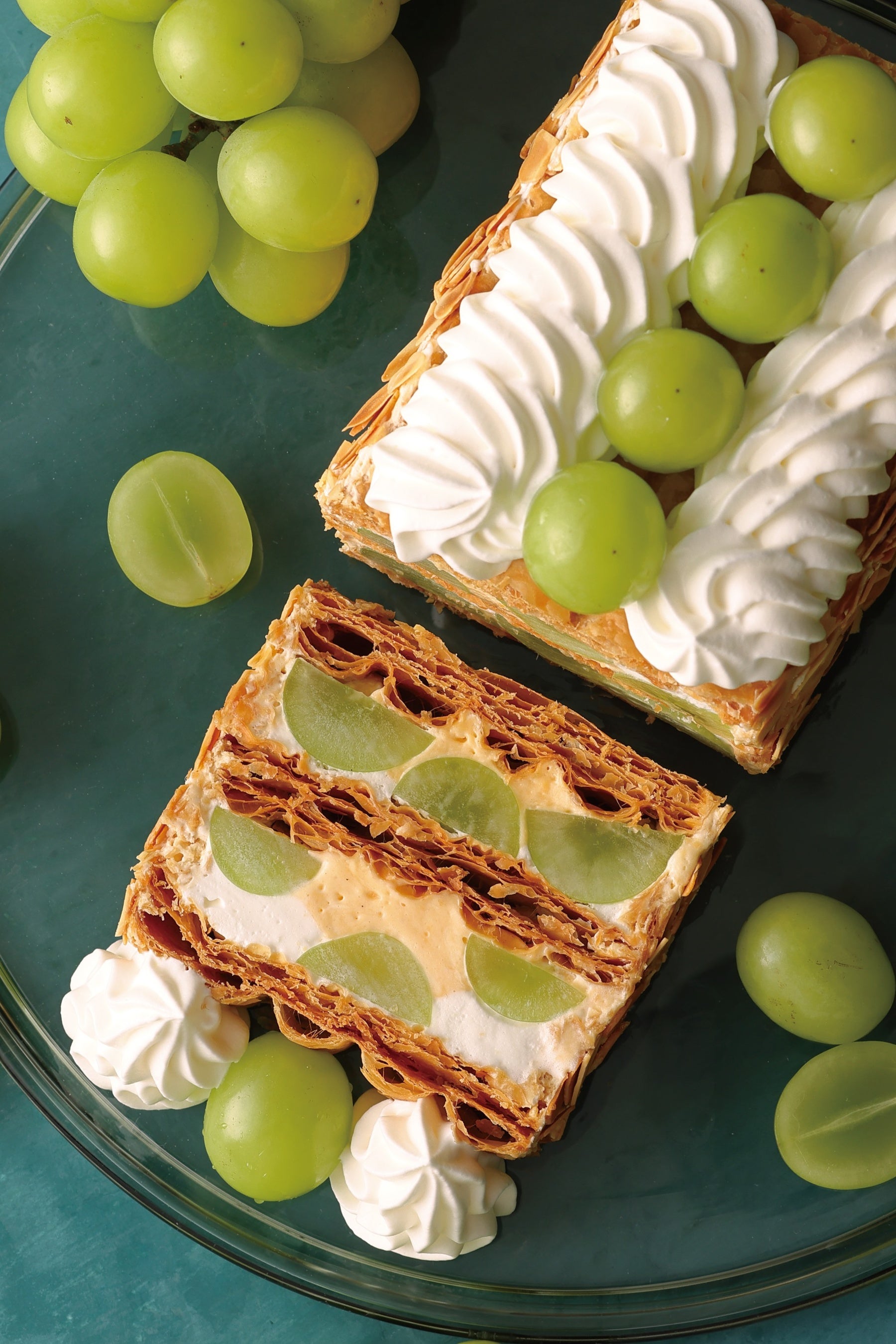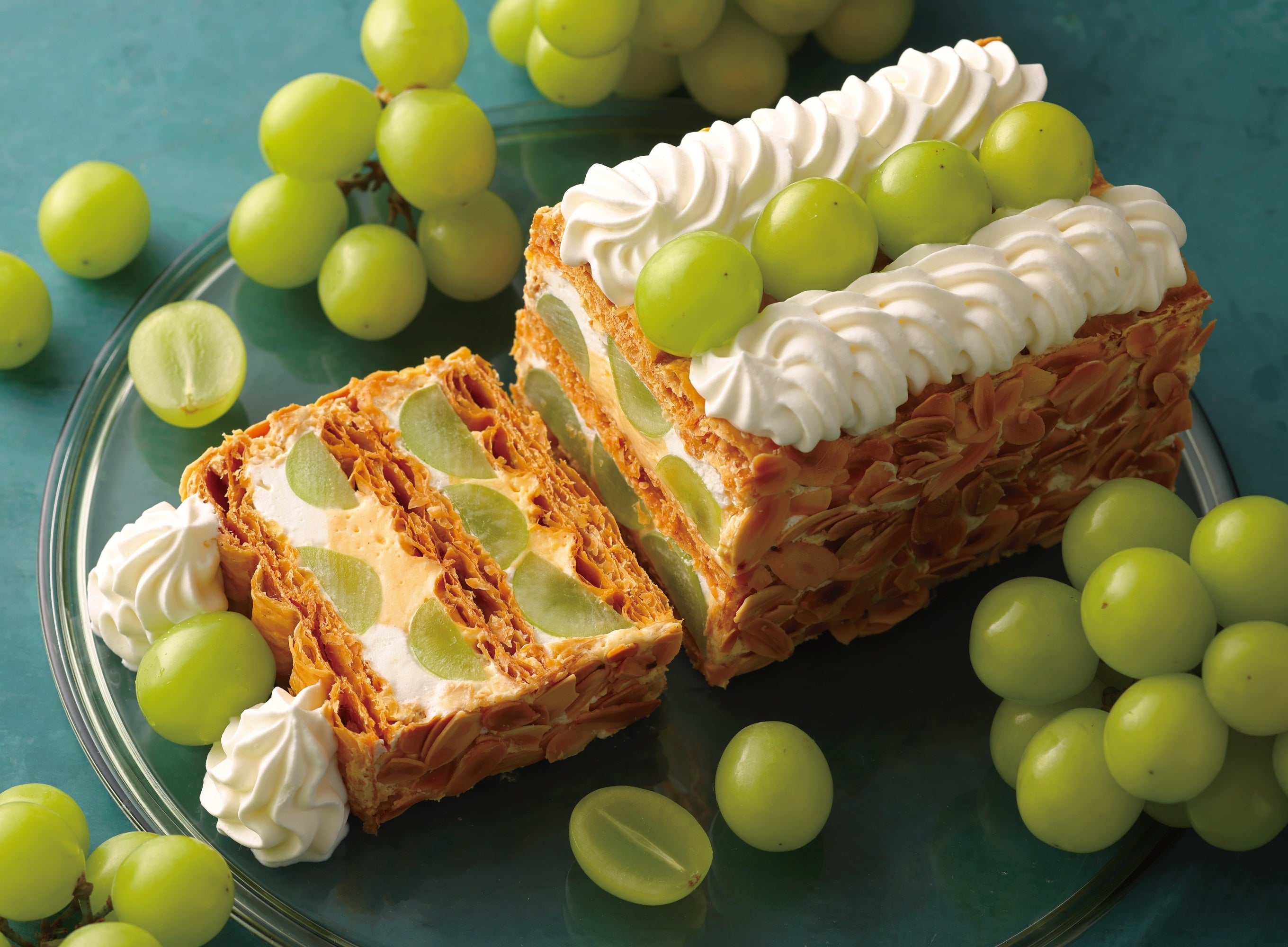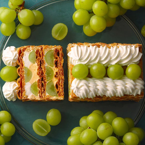 KIHACHIの定番ナポレオンパイを弾ける甘さと芳醇な香りが口いっぱいに広がるシャインマスカットでアレンジ。爽やかな甘さとサクサクのパイ生地が癖になる一品。