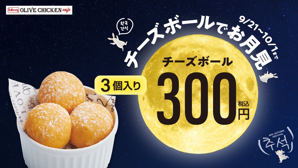 【bb.q オリーブチキン】十五夜はチーズボールでお月見しよう9/21~10/1 チーズボール3個300円キャンペーン開催