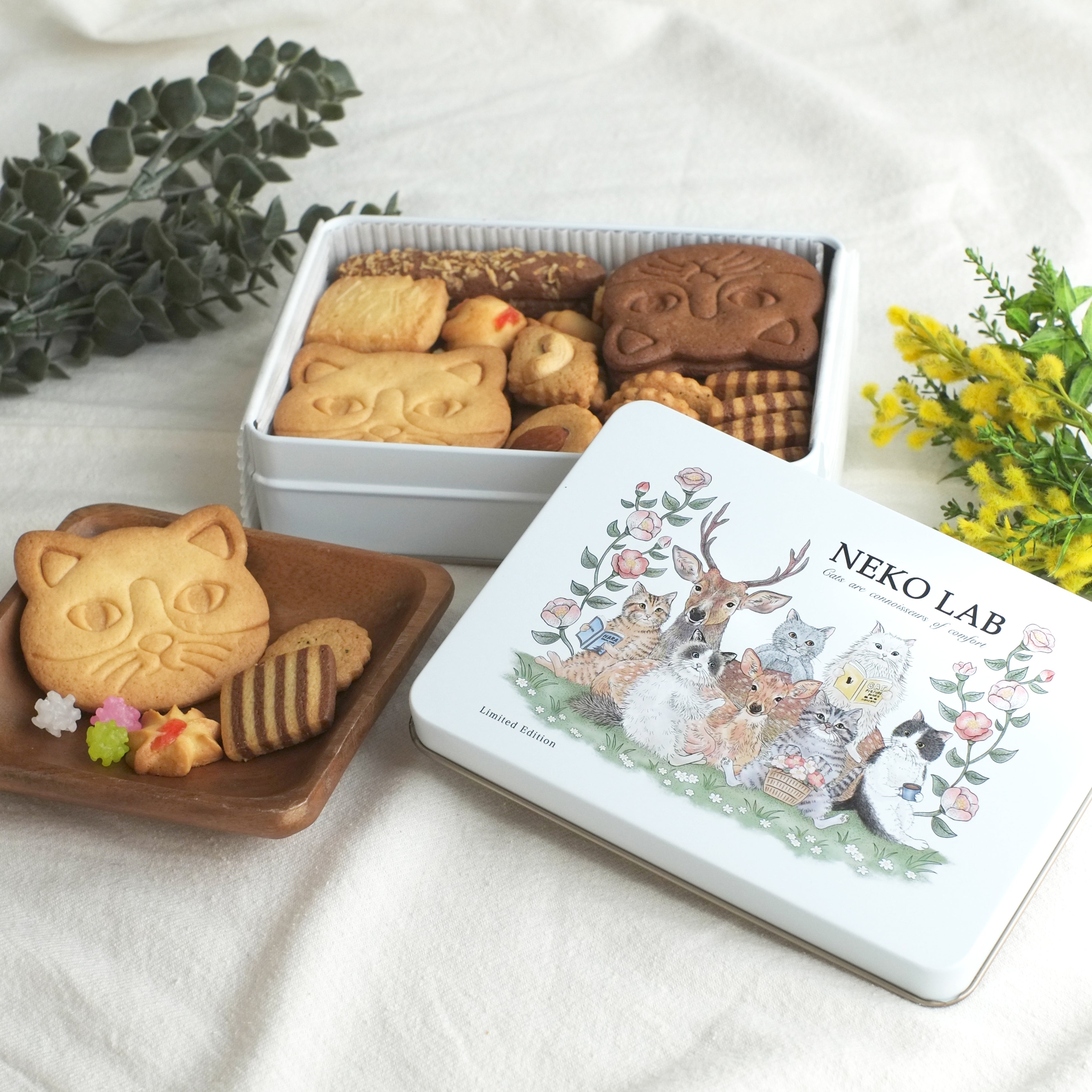 ネコの可愛さがいっぱい詰まったクッキー缶には、NEKO LABオリジナルのクッキー型で製造した愛らしい猫顔のクッキーとバラエティに富んだ数種のクッキー、彩り豊かな金平糖をぎっしりと詰めこんだ大満足な内容となっています。