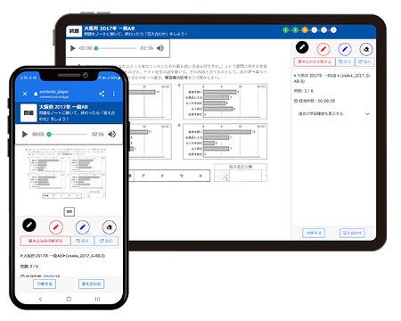 スマホ、タブレット、PCでの受講に対応。アプリのインストールは不要。学習塾でも自宅でも、生徒が自立的に練習できるICT教材として、講師の手間をかけず効率的に実施できます。