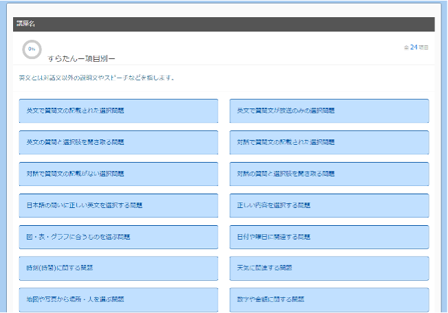 「英文で質問文の記載された選択問題/質問文が放送のみの選択問題」「対話で質問文の記載された選択問題/質問文の記載がない選択問題」「日本語の問いに正しい英文を選択する問題」など、選べる出題形式は全部で24項目。