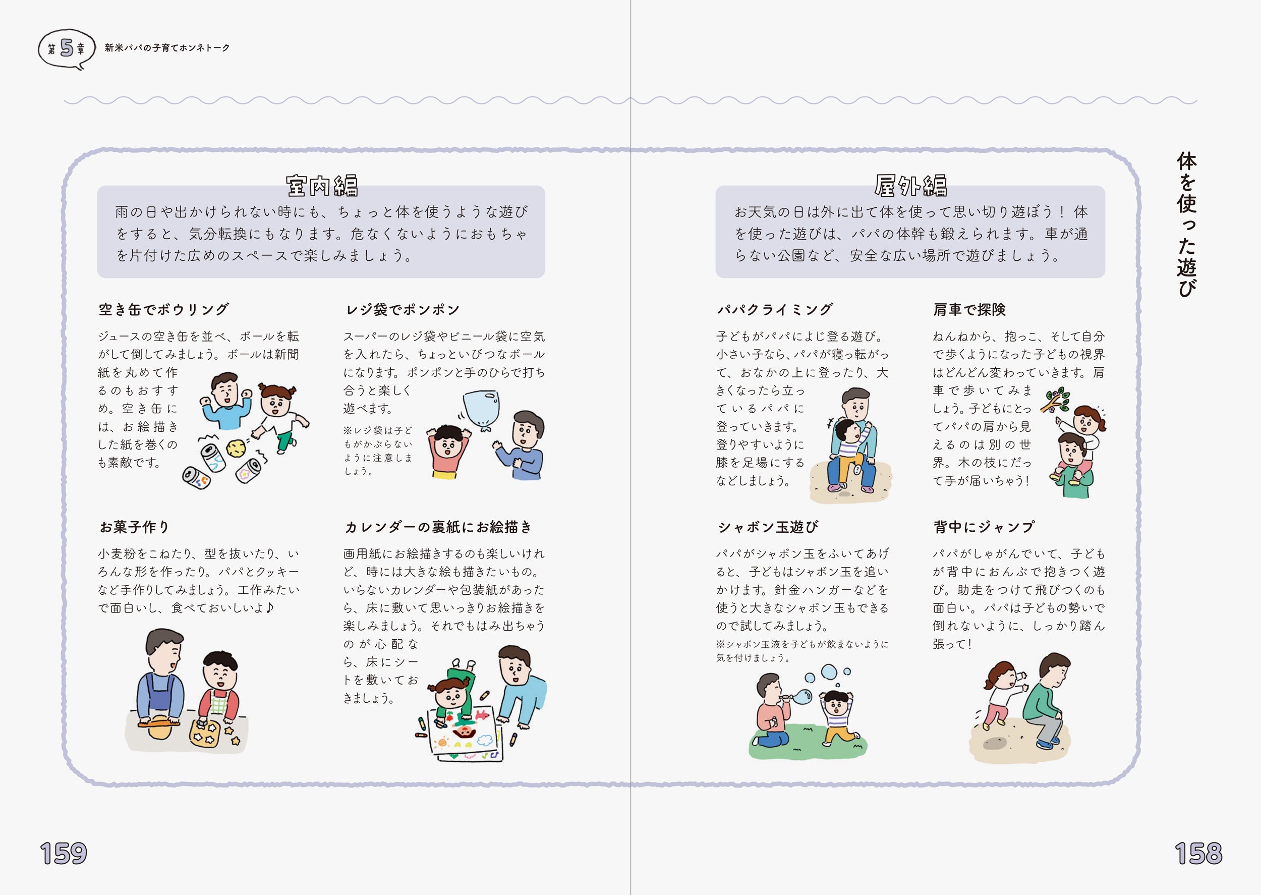 パパの子育ての具体的でリアルなホンネと、子育てと仕事の両立での実際の悩み&その緩和策、子どもと二人っきりの時の遊びかたなど、育児の実践を紹介することで、同じ境遇にいるパパの背中を後押し&応援する本です。本書を読めば、期間限定である〝子育て〞を楽しむきっかけを得られます!