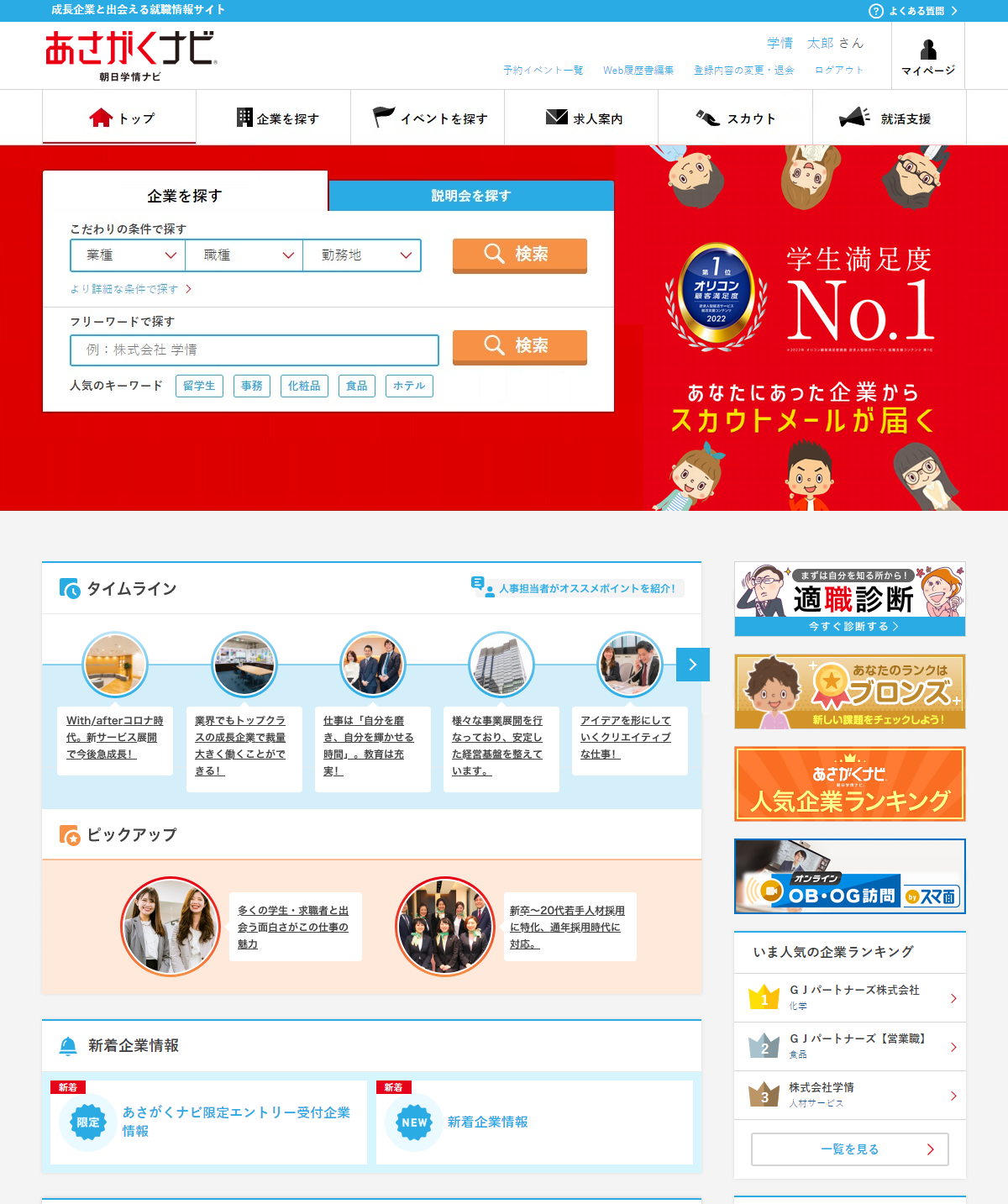 会員数40万名、学生満足度No.1のスカウト型就職サイト(※2022年 オリコン顧客満足度(R)調査 逆求人型就活サービス 就活支援コンテンツ 第1位)。ダイレクトリクルーティングサイト会員数3年連続No.1(※2020年~2022年 東京商工リサーチ調査 ダイレクトリクルーティングサイト会員数 第1位)も獲得しており、最も多くの学生を対象にスカウト配信が可能です。「あさがくナビ」は動画型ダイレクトリクルーティングサイトとして、動画を通して、リアル(企業の雰囲気や社員の声)を体感できるコンテンツを拡充させています。また、「スカウト」と「職種別掲載」で企業にマッチする優秀人材の採用を支援。テレワークの普及・定着で注目が高まる“ジョブ型採用”を可能にする、職種別掲載機能を実装するなど、マッチング精度のさらなる向上に取り組んでいます。朝日新聞のその日の記事から社会や業界に関してのトピックスを就活目線でわかりやすく解説した「今日の朝刊」など、就活ノウハウだけでなく、社会や世の中を知るためのコンテンツを提供しています。