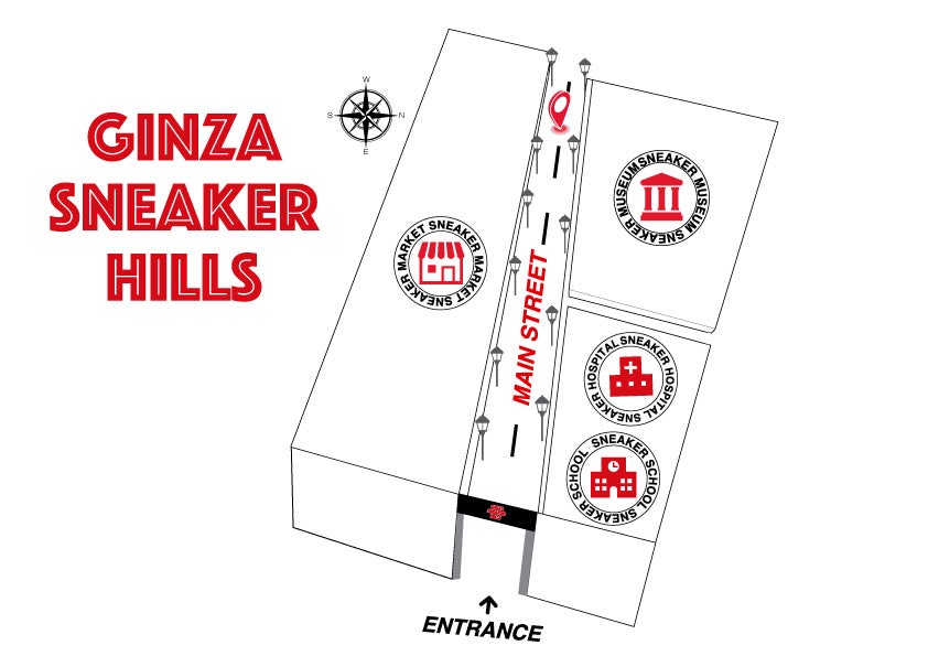 スニーカーマニアが集う“基地”をコンセプトに、<MARKET><MUSEUM><SCHOOL><HOSPITAL>の4つセクションで構成します。