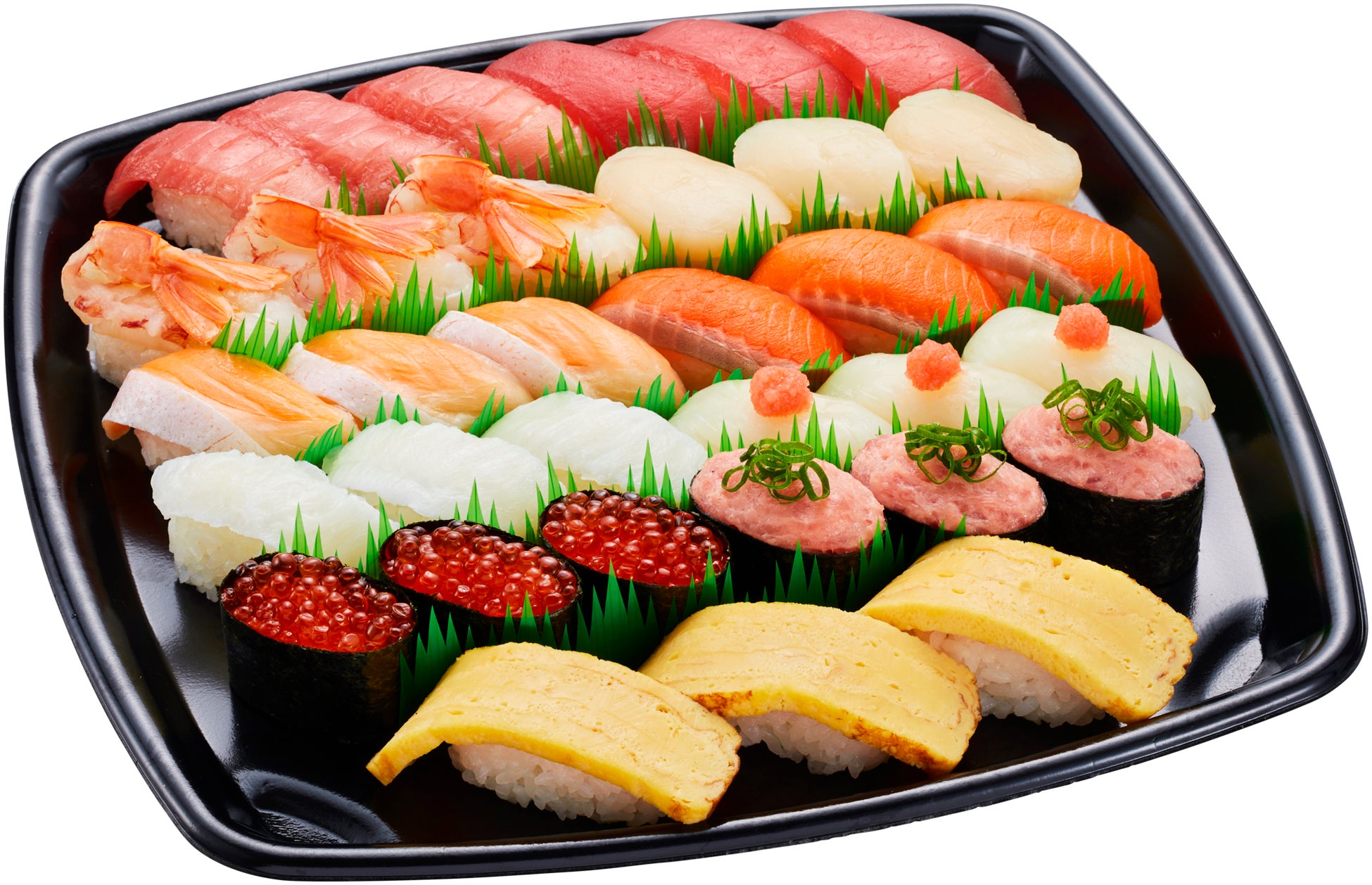 中とろ、まぐろ、赤えび、ほたて、とろサーモン、サーモン、えんがわ、天然むらさきいか たらこのせ、特盛いくら、特盛ねぎとろ、玉子