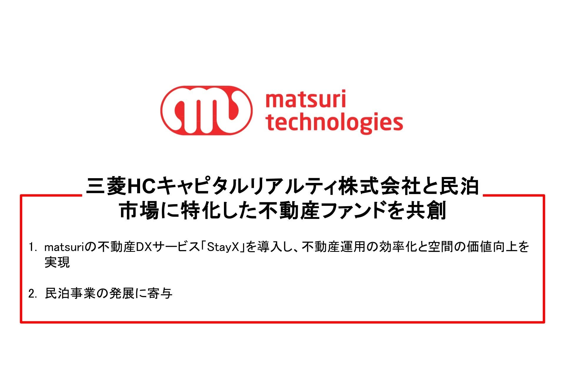 ソフトウェアを主軸に、空間の価値を最大化するソリューション「StayX」を運営するmatsuri technologies株式会社(本社:東京都新宿区)は、株主である三菱HCキャピタルリアルティ株式会社(本社:東京都千代田区)と民泊に特化した不動産ファンドにおいて協働したことをお知らせいたします。