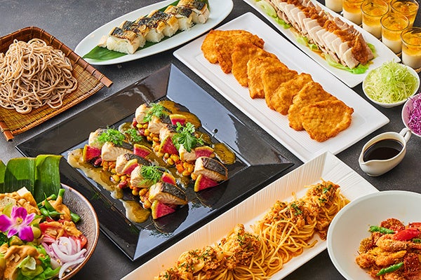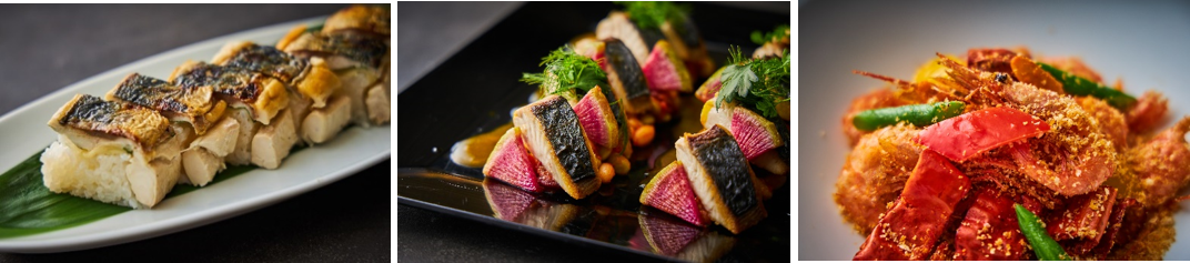 福井県の名物のひとつ「焼き鯖寿司」は、うまみたっぷりの肉厚な鯖がのった贅沢なお寿司です。中に挟んだ生姜、大葉が口の中をサッパリとさせ、ついつい箸が止まらなくなる一品です。秋に旬を迎える福井県産の鰆を使った「福井県産鰆のプランチャ ブールブランとカロチーノオイルのエマルジョン」は、鉄板焼きにしたほどよい脂身と上品な味わいの鰆に、まろやかな味わいのバターソースとクセのないサラッとしたアンチエイジング オイルを混ぜたソースをあわせてお召し上がりください。殻ごと食べられる甘えびを揚げ、ココナッツ・唐辛子・ ガーリック・パン粉などで作ったスパイシーなパウダーをまとった「もちえび(福井県産脱皮甘えび) スパイシー揚げ」は、越前の甘えびを丸ごとお楽しみいただけます。その他にも、日本料理・西洋料理・中国料理・スイーツの各専門シェフの珠玉の料理の数々を余すことなくご堪能ください。