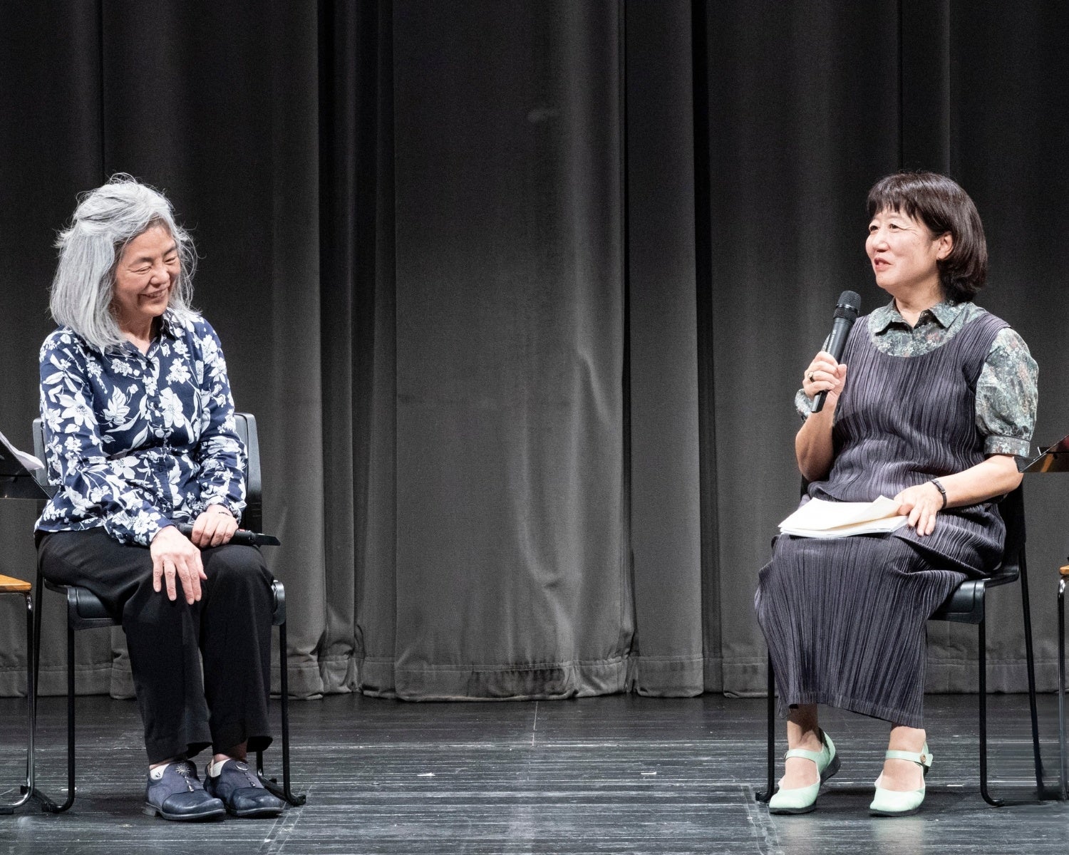 聞き手を務めた松永美穂さんはドイツ文学の翻訳家で、多和田葉子さんと長年親交のある文学者です。「日本では小説家のイメージが強いかもしれませんが、実は早い時期から戯曲も書いていらっしゃいました。今日はオペラの話なので、戯曲のことをまず伺っていこうと思います」とトークを始めました。