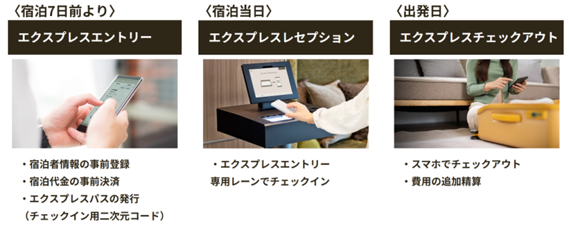 本サービスにより、住所情報やパスポートの事前登録、室料や宿泊税などのオンライン決済をホテル到着前に完了することが可能となります。さらに、エクスプレスエントリーで事前チェックイン手続きを完了したお客様は、本サービス専用のチェックイン機『エクスプレスレセプション』(※3)やスマートフォンでチェックアウトが完了する『エクスプレスチェックアウト』(※4、5)のご利用により、よりスムーズでストレスフリーな滞在をお楽しみいただけます。