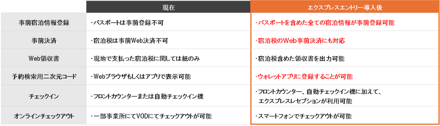 現在、「事前QRチェックイン」や予約サイトを活用することで、一部の宿泊情報登録や事前決済、Web領収書の出力が可能ですが、「エクスプレスエントリー」の導入により、パスポート情報を含むすべての宿泊情報が事前登録可能となるほか、宿泊税を含む宿泊費用のWeb事前決済、領収書のオンライン出力、予約検索用QRコード(※9)のウォレットアプリ登録など、サービス内容が大幅に拡充されます。