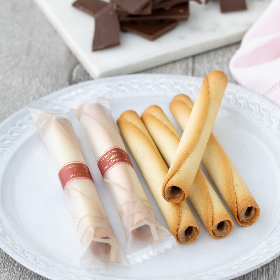 バターをふんだんに使った生地を焼き上げ、くるっと巻いてミルクチョコレートを詰めました。サクッとした食感とやさしい甘さが楽しめます。