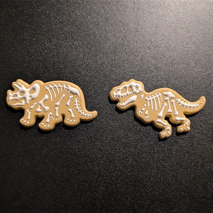 恐竜のシルエットをかたどった本物のクッキーのようなマグネット。アイシングクッキー風の骨格模様が、かわいらしく表現されています。