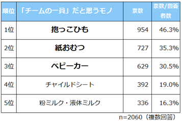 2位と200票以上の差をつけて「抱っこひも」が1位に。外出時もおうちでも使う場面が多く、大変な時に助けてくれるアイテム。