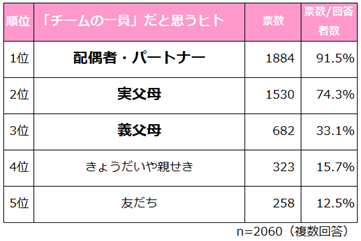 2位の「実父母」も1530票を集め、「子育てを経験しているから、なんでも相談出来る」など心強いサポーターであることが分かりました。