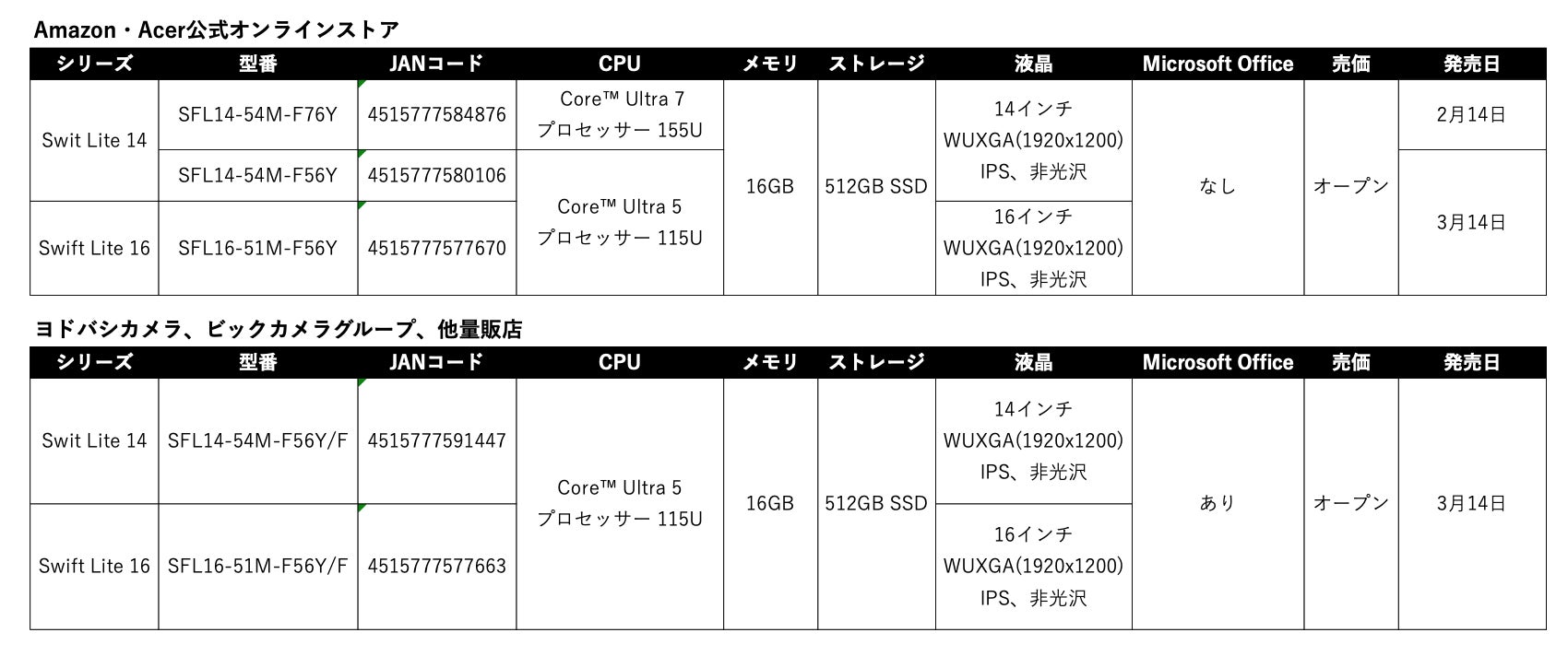 日本エイサー株式会社(本社:東京都新宿区、代表取締役社長:ボブ・セン)は、軽量かつ高性能で、AI処理にも対応したノートパソコンの新シリーズ「Swift Lite」を発売いたします。本シリーズより、14インチ の「SFL14-54M-F76Y 」「SFL14-54M-F56Y 」、および16インチの「SFL16-51M-F56Y 」を、AmazonおよびAcer公式オンラインストアにて販売開始します。さらに、量販店モデルの14インチ 「SFL14-54M-F56Y/F 」と16インチ「SFL16-51M-F56Y/F 」はヨドバシカメラ、ビックカメラグループ、およびその他量販店より発売いたします。