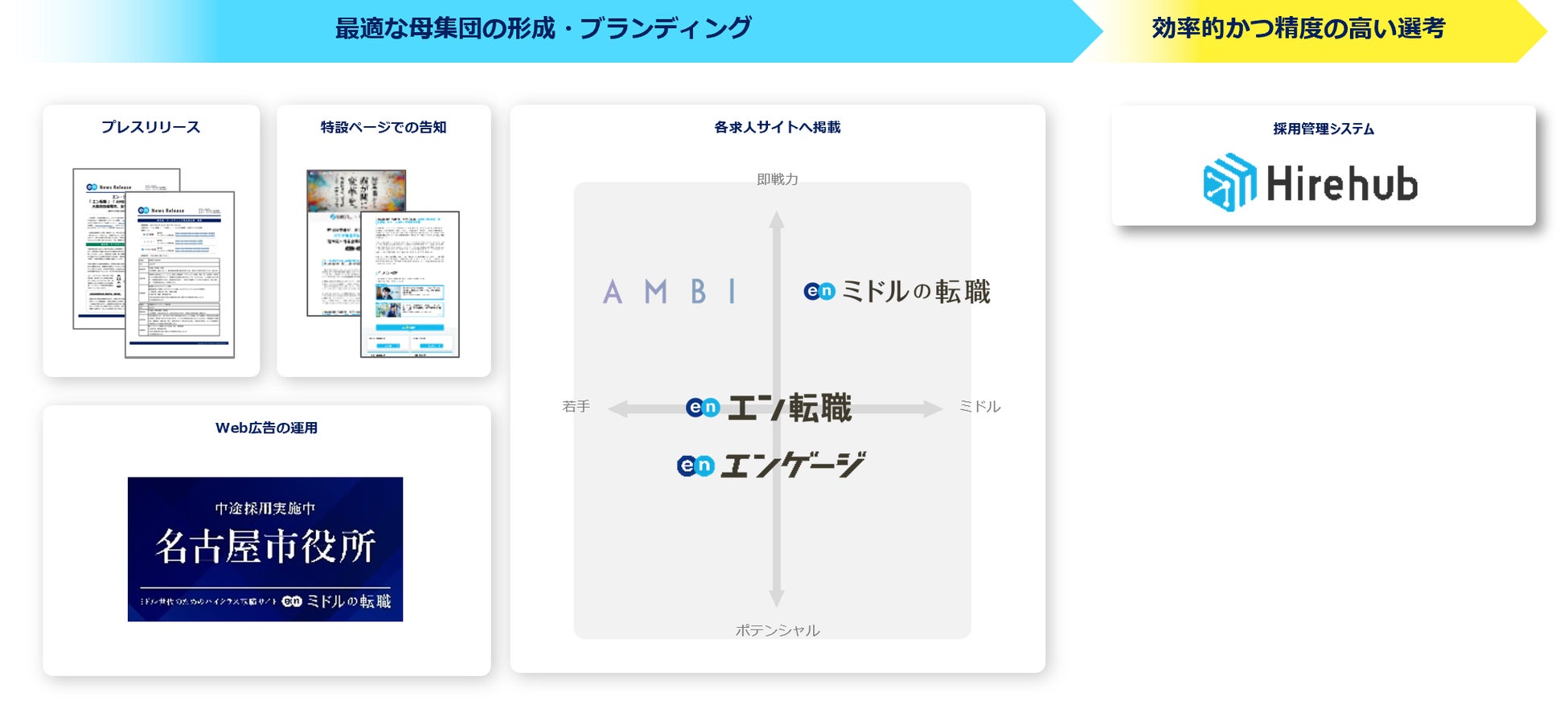 プレスリリースや特設ページ、Web広告での告知に加え、各求人サイトでの集客支援を実施。『エン転職』『エンゲージ』『AMBI』『ミドルの転職』とターゲットの異なる求人サイトを活用することで、ターゲットへ網羅的に求人を届けます。さらに、採用管理システム『Hirehub』の提供により、選考フローを支援。求職者との適切なマッチングを実施します。