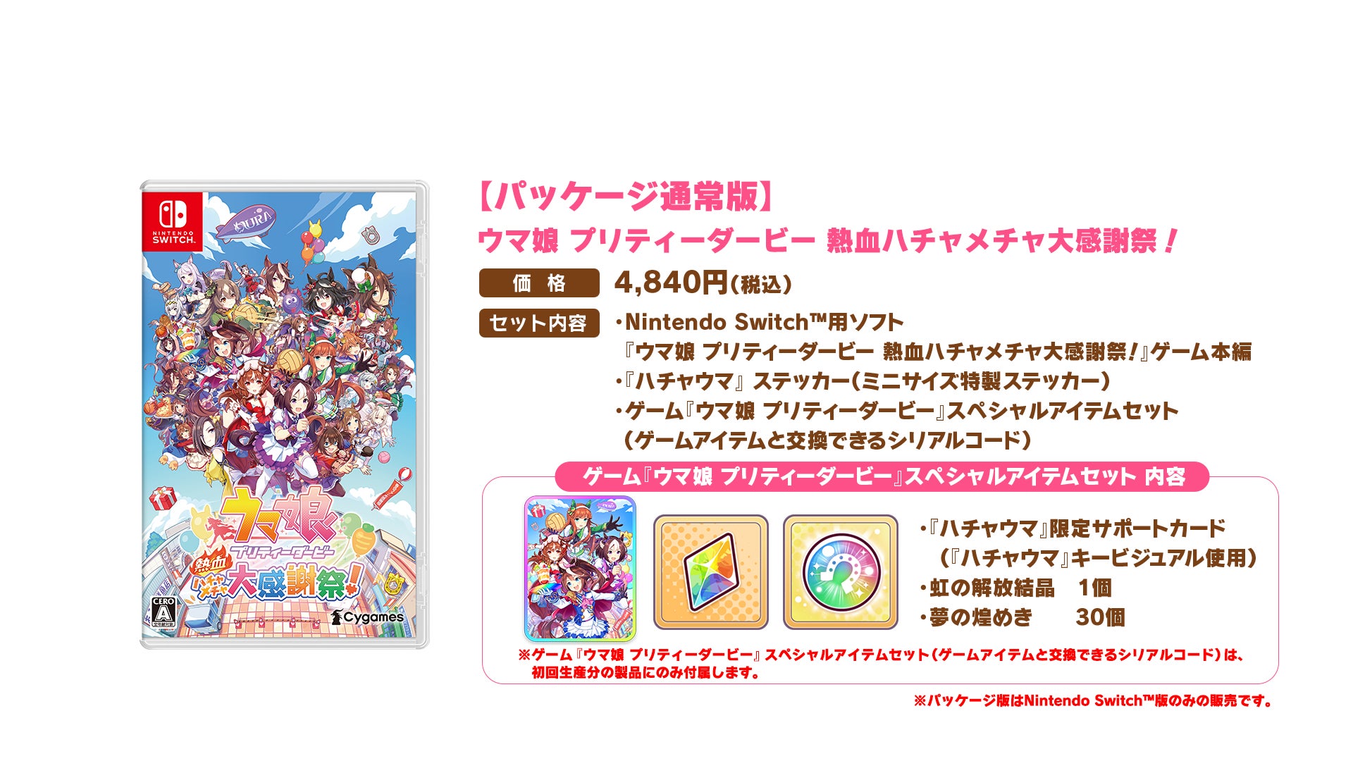 Nintendo Switch™パッケージ版、Nintendo Switch™/PlayStation®4/Steam®ダウンロード版をそれぞれ発売いたしました。通常版のほか、追加DLC第1弾~第3弾とゲーム内で設定可能な称号が付属する「ウマ娘 プリティーダービー 熱血ハチャメチャ大感謝祭!チームセット」が含まれる特別なエディションもご用意しております。