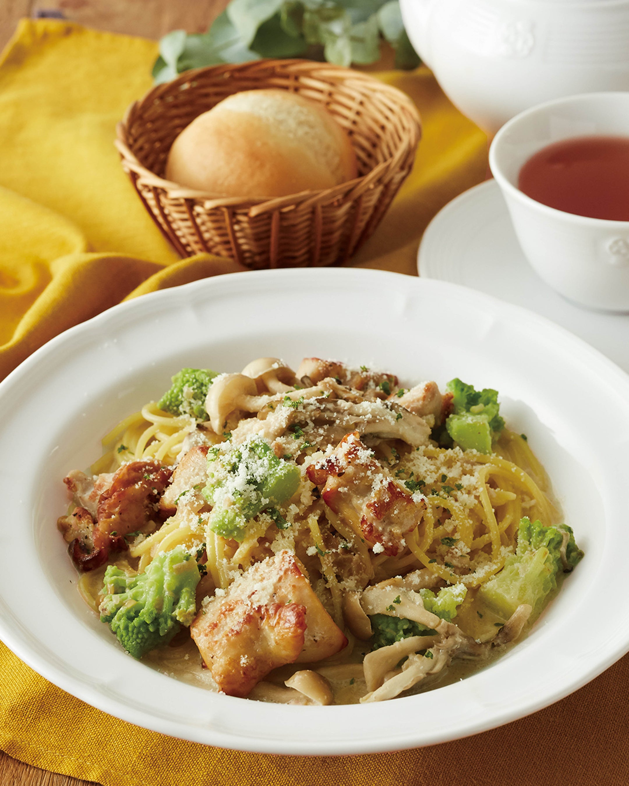 ポルチーニや、たまり醤油などを使用したコクのあるクリームソースに、ローストチキンと舞茸、しめじ、ロマネスコを合わせました。
