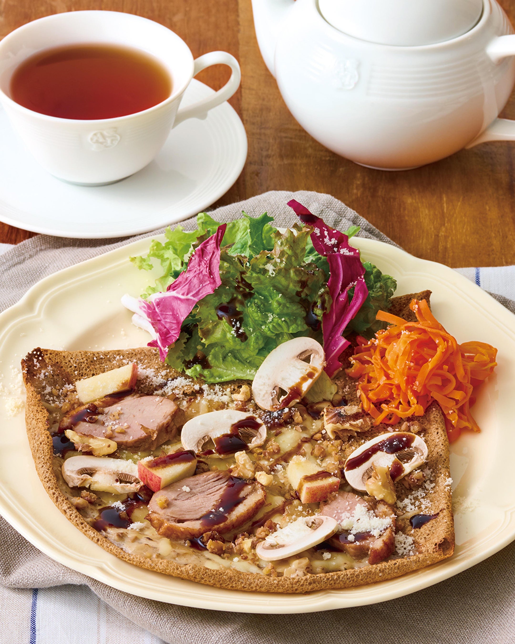 紅茶鴨、トリュフの香りが広がるマッシュポテト、チーズをのせ焼き上げたそば粉ガレットに、栗、マッシュルーム、りんごなどをトッピングし、キャロットラペを添えました。バルサミコソースの酸味がアクセント。