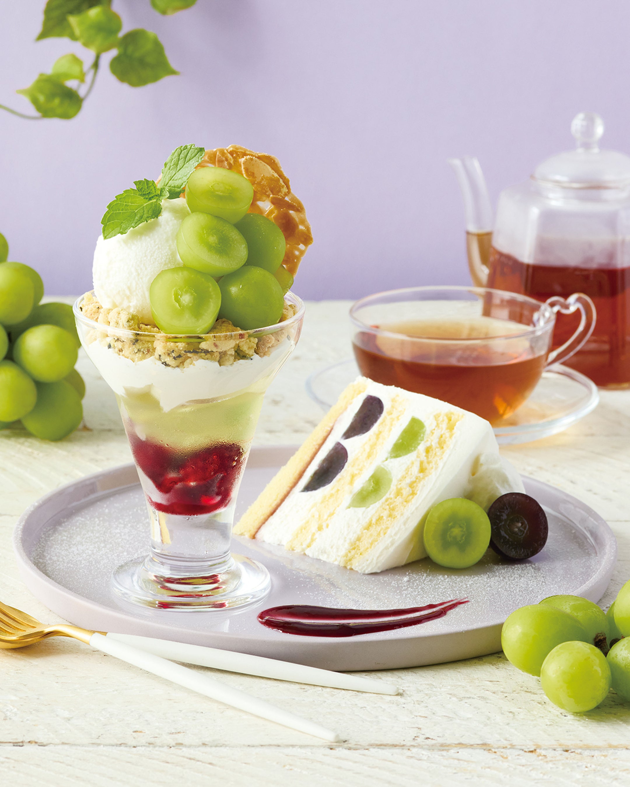 14時~限定。葡萄を贅沢に使用した2種のスイーツと紅茶を楽しむ、葡萄づくしのスペシャルセット。ショートケーキはシャインマスカットと巨峰をふわふわのスポンジでサンドしました。シャインマスカットのパフェは、ラズベリー、エルダーフラワーとりんご風味のゼリー、チーズホイップ、クリームチーズジェラートとのハーモニーを楽しんで。