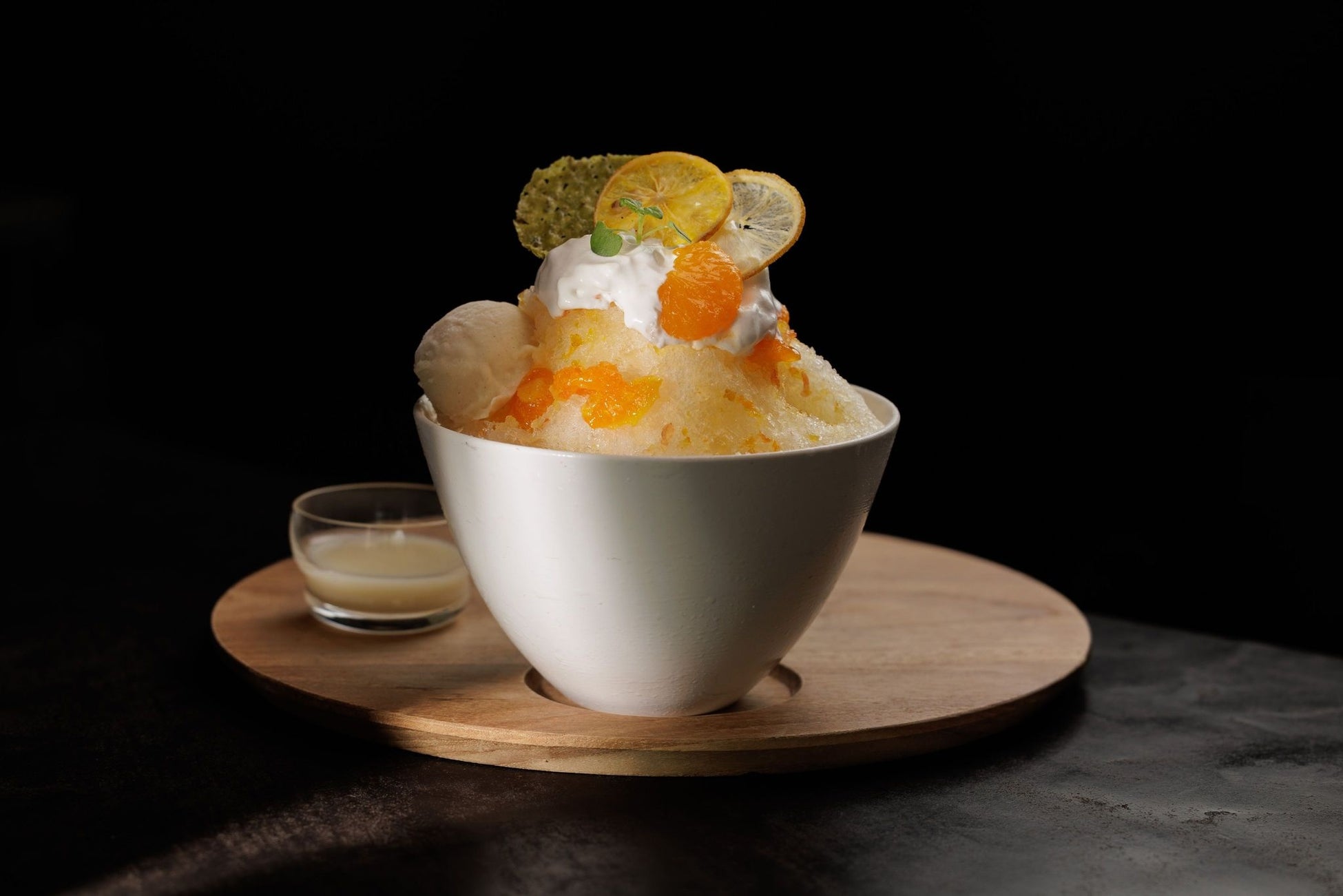 化学肥料・除草剤を使用せず天然肥料かつ減農薬で育てられた石川県金沢産のゆずと、熊本県産の有機栽培の柑橘類を3〜4種類ブレンド。さわやかな香りとゴロっとした果肉の食感が楽しめる一品。実山椒チュイール、シトラスチップ、冷凍みかん、豆乳アイスクリーム、そして豆乳クリームが乗せられ、豊かな食感と味わいが楽しめます。
