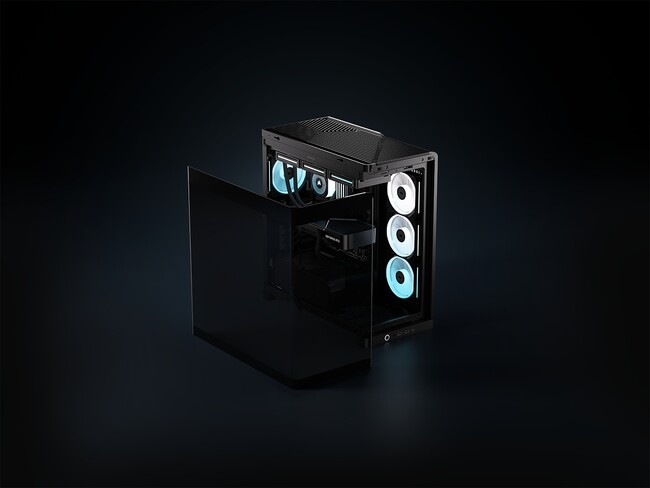 「FRAME 4500X」シリーズには、曲面強化ガラスパネルを搭載。InfiniRailシステムにより、柔軟なレイアウトでファンを取り付けられるほか、トップと右サイドには高エアフローパネルを採用しています。