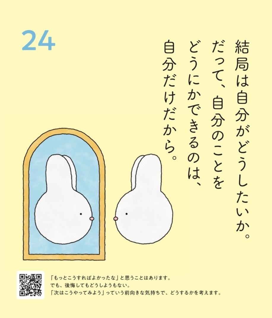 ページの左下の二次元バーコードから、その日の言葉について語ったYouTube「ハロー!ミキティ」の配信回に飛べるから、もっとじっくりミキティの言葉を聞きたい人におすすめ。
