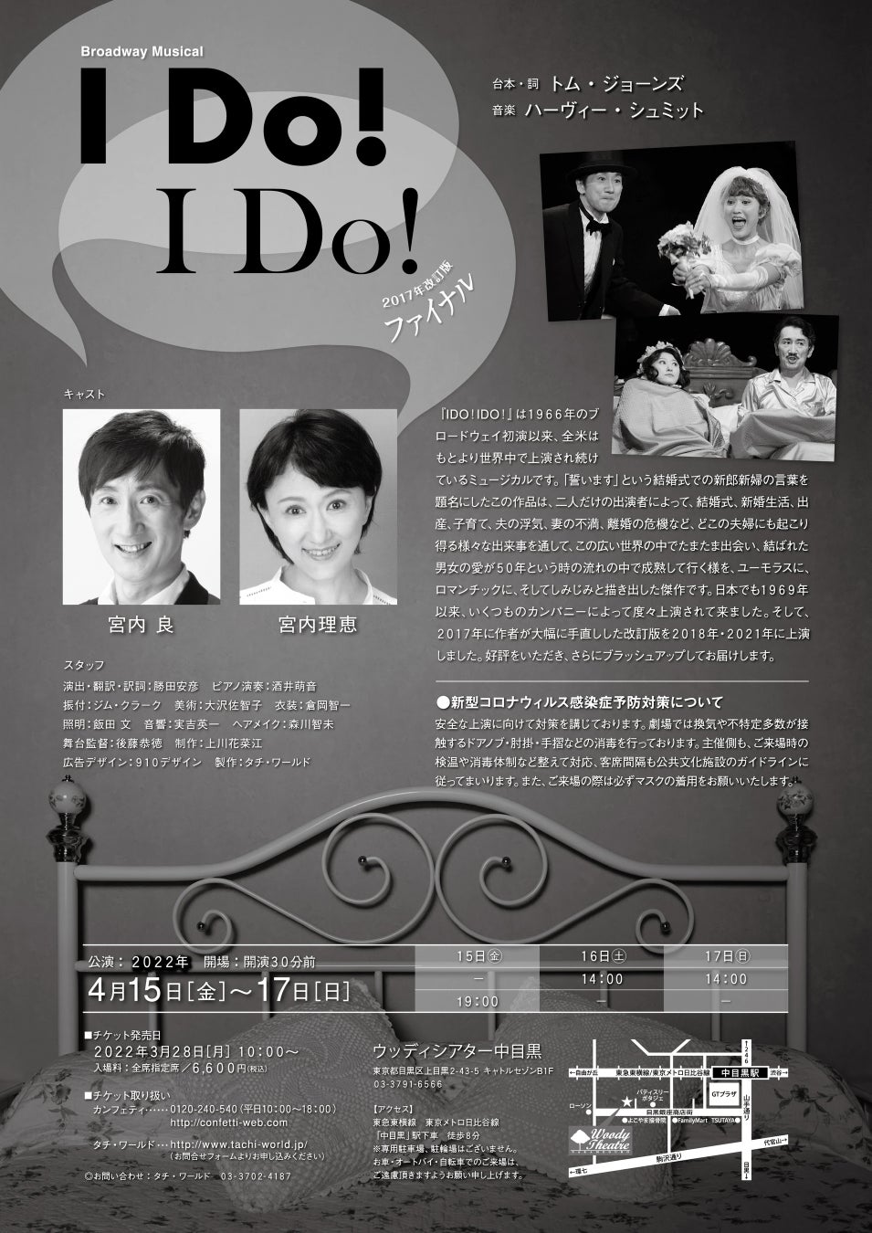 有限会社タチ・ワールド(東京都世田谷区、代表:舘 信行)主催、ブロードウェイ・ミュージカル『I DO! I DO!』が2022年4月15日(金)~4月17日(日)にウッディシアター中目黒(東京都目黒区)にて上演されます。チケットはカンフェティ(運営:ロングランプランニング株式会社、東京都新宿区、代表取締役:榑松 大剛)にて3月28日(月)10:00より発売開始です。