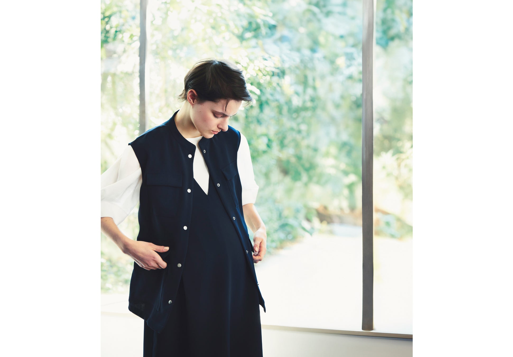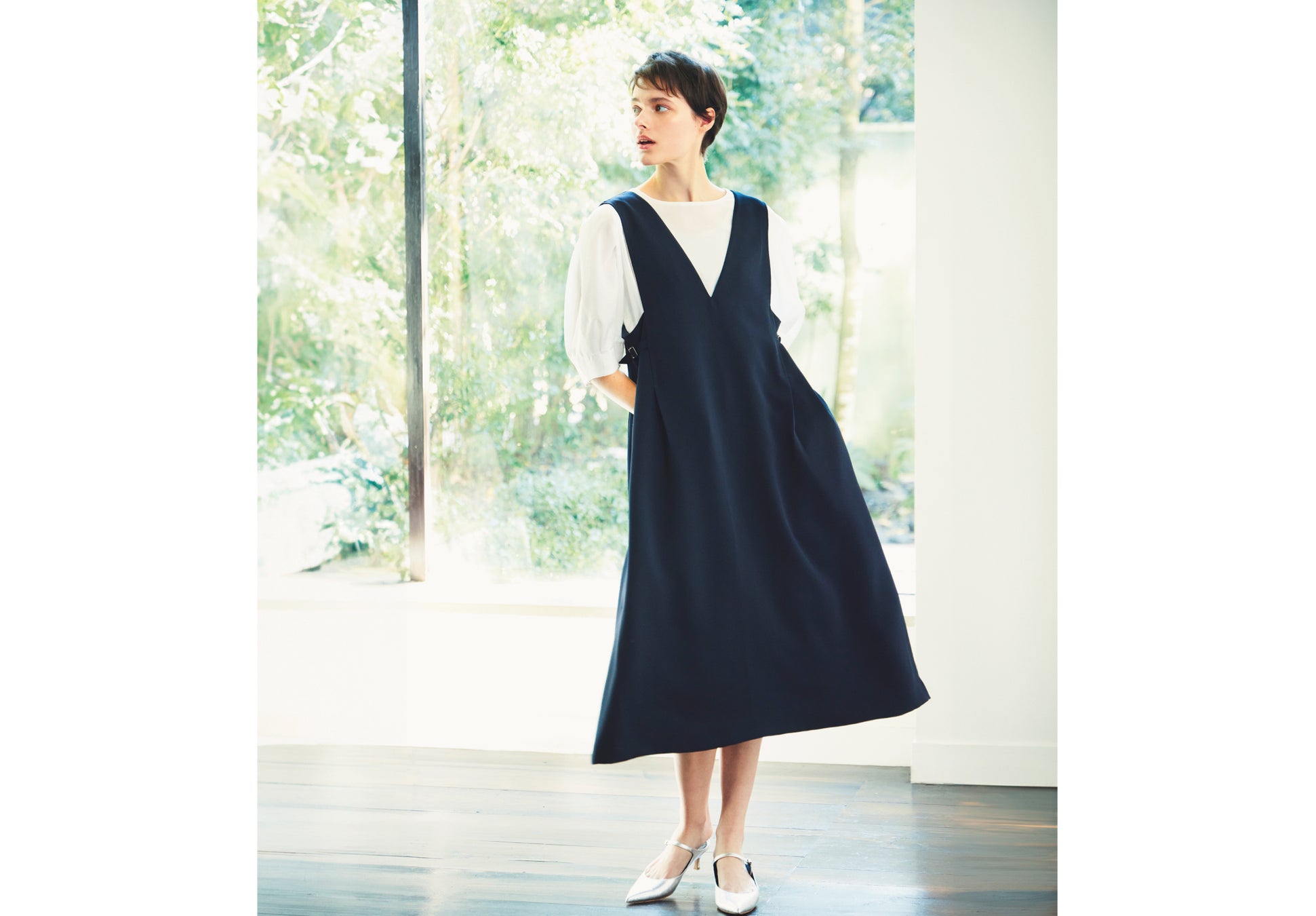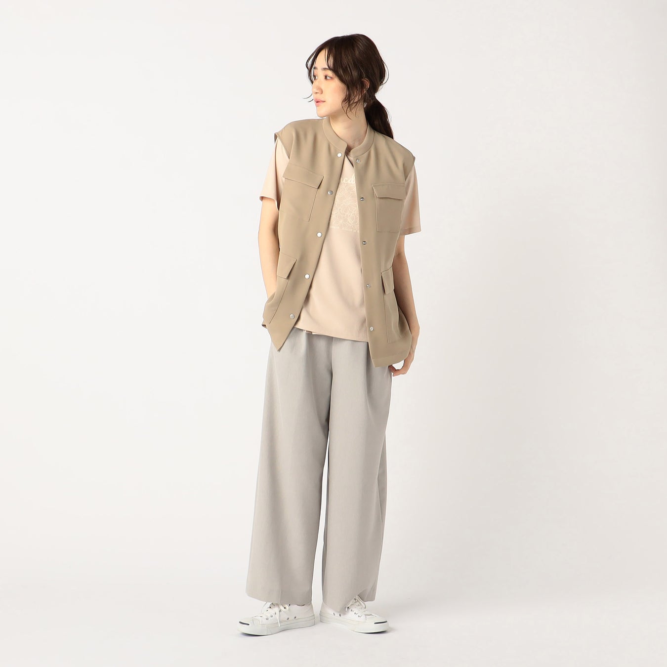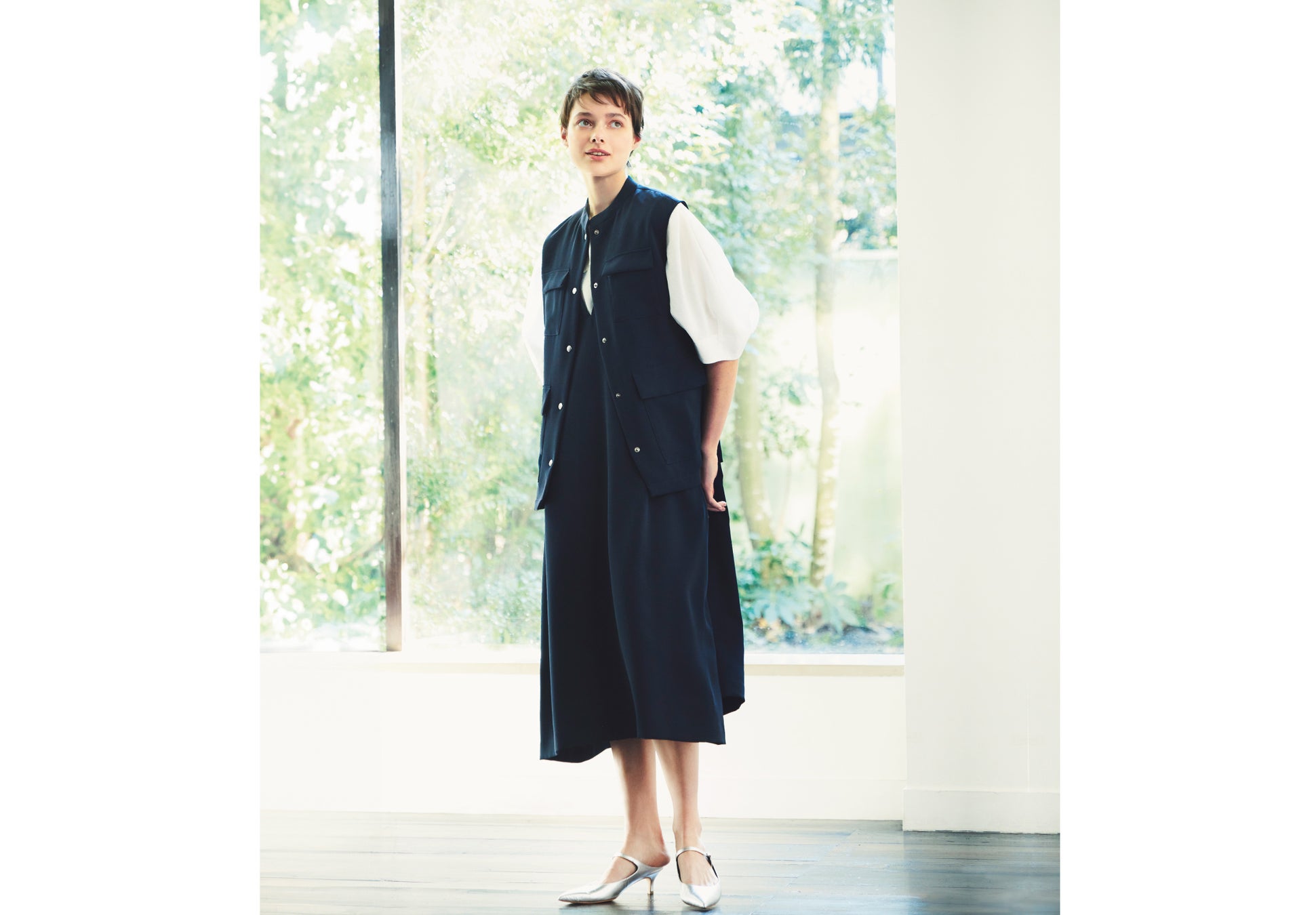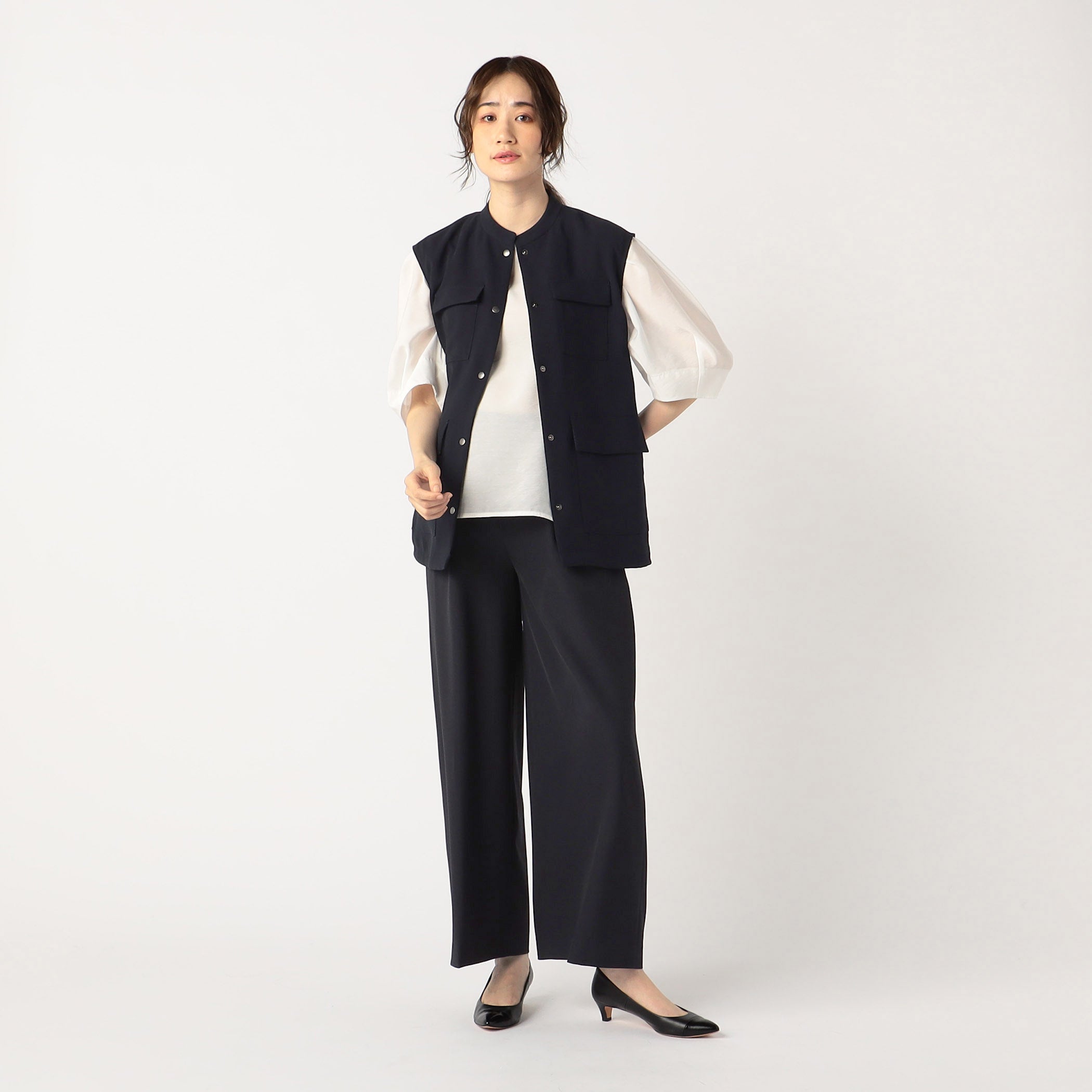 ドライタッチで汗ばむこれからの季節にピッタリな素材を使用して、ジレとジャンパースカートをつくりました。セットアップとしてはもちろんのこと、単品でも汎用性があるので様々なスタイリングが叶います。ジレもジャンパースカートも、インナーの合わせ方によりカジュアルにもきれいめにも着られるので、シーンに合わせたコーディネートを楽しめます。