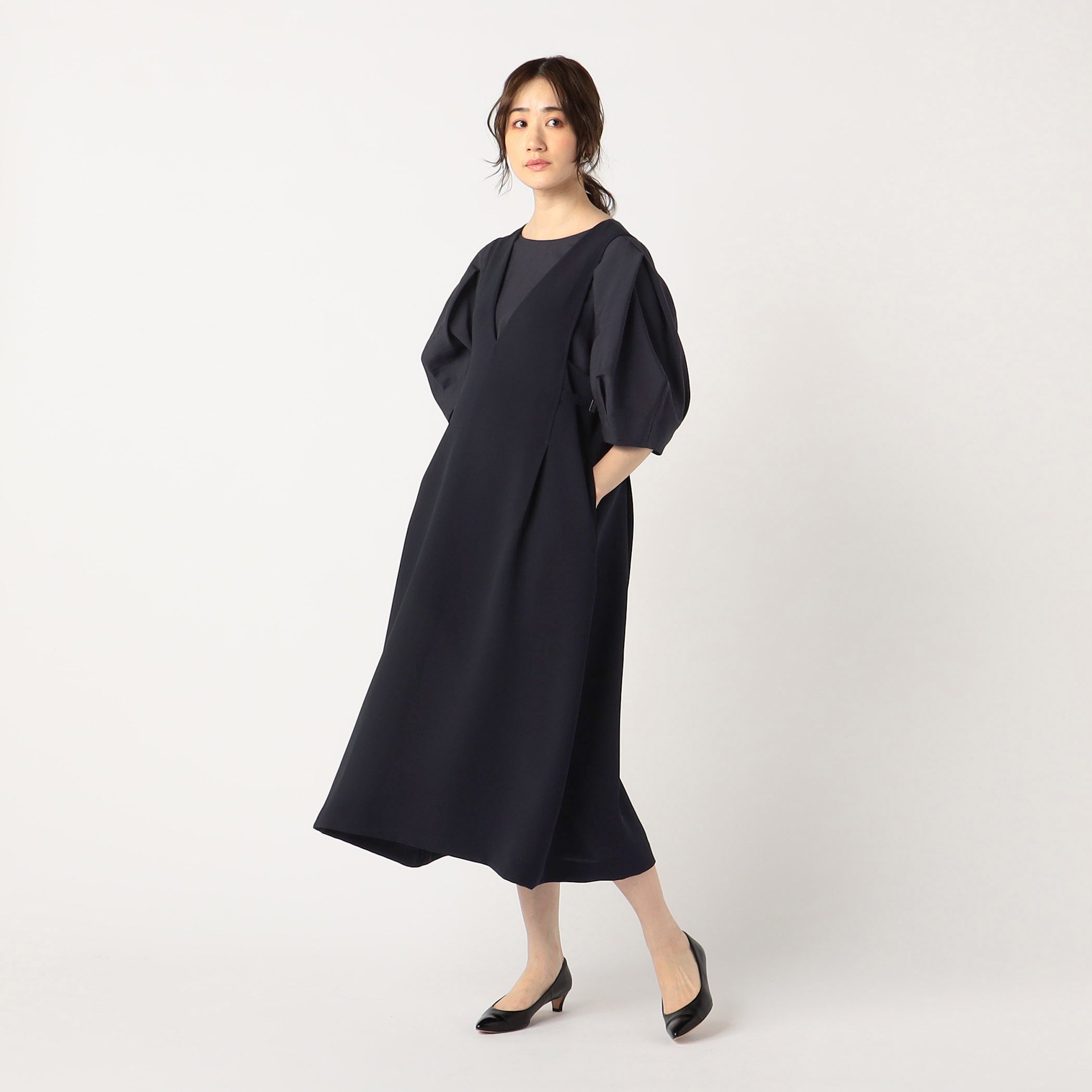 ・タックから広がるAラインシルエットが特徴です。