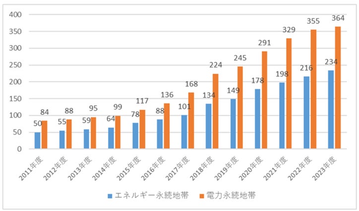 域内の民生・農林水産業用エネルギー需要を上回る地域的な再生可能エネルギーを生み出している市町村(エネルギー永続地帯、地域エネルギー自給率が100%を越える自治体)の数が、2023年度に234になりました。2011年度には50だったところ、2023年度に4.7倍になったことになります。